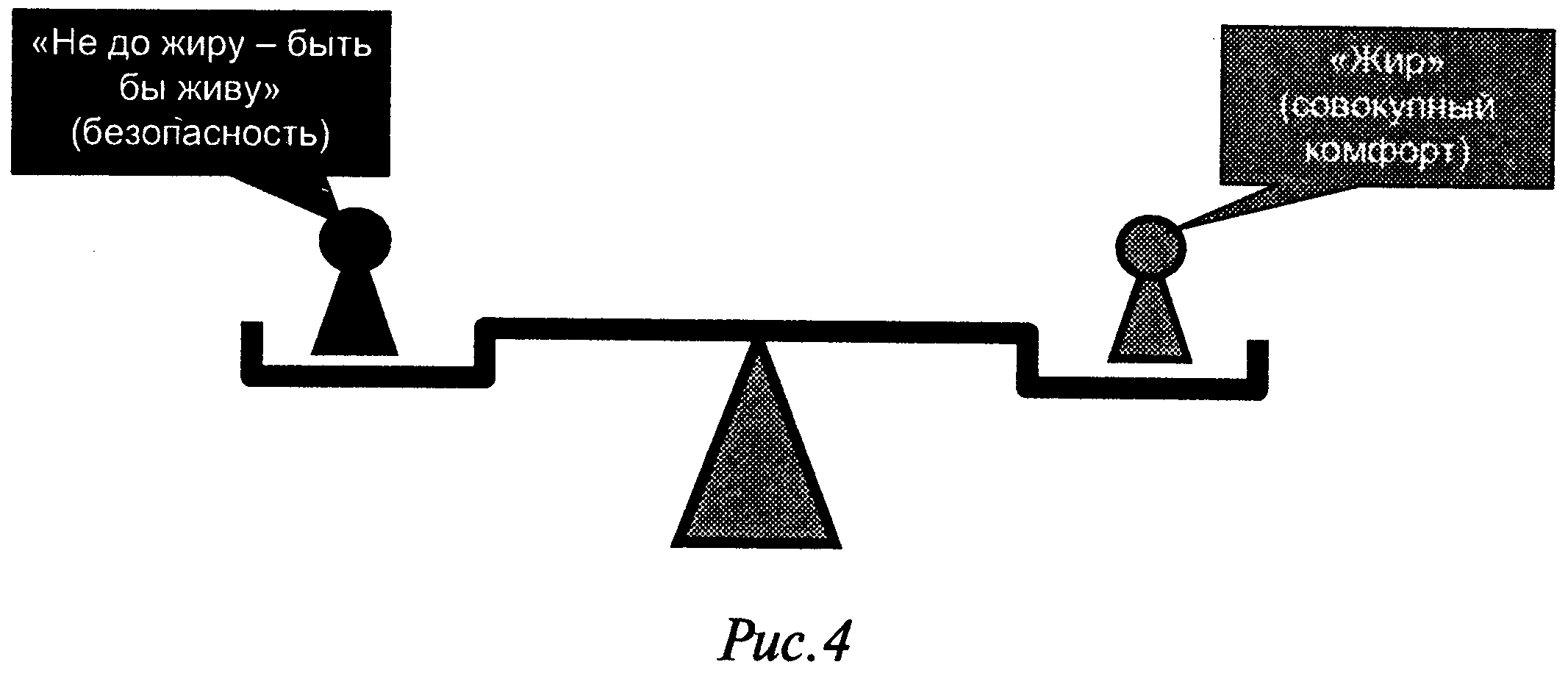 Итак, как найти подобный скальпель? Что положить на другую чашу весов? Что сказать своим согражданам? А точнее, что они сами должны сказать для того, чтобы все изменилось? При том, что ничего они не хотят, кроме как «беситься с жиру»? Значит, им надо предъявить что-то такое, чтобы они сказали: «Не до жиру – быть бы живу». Например, горящих людей, выпрыгивающих из окон «близнецов» в Нью-Йорке. А может, что-нибудь и похлеще. Короче, на одной чаше весов должен оказаться «жир» (он же комфорт), а на другой – «быть бы живу» (безопасность) – (рис.4).