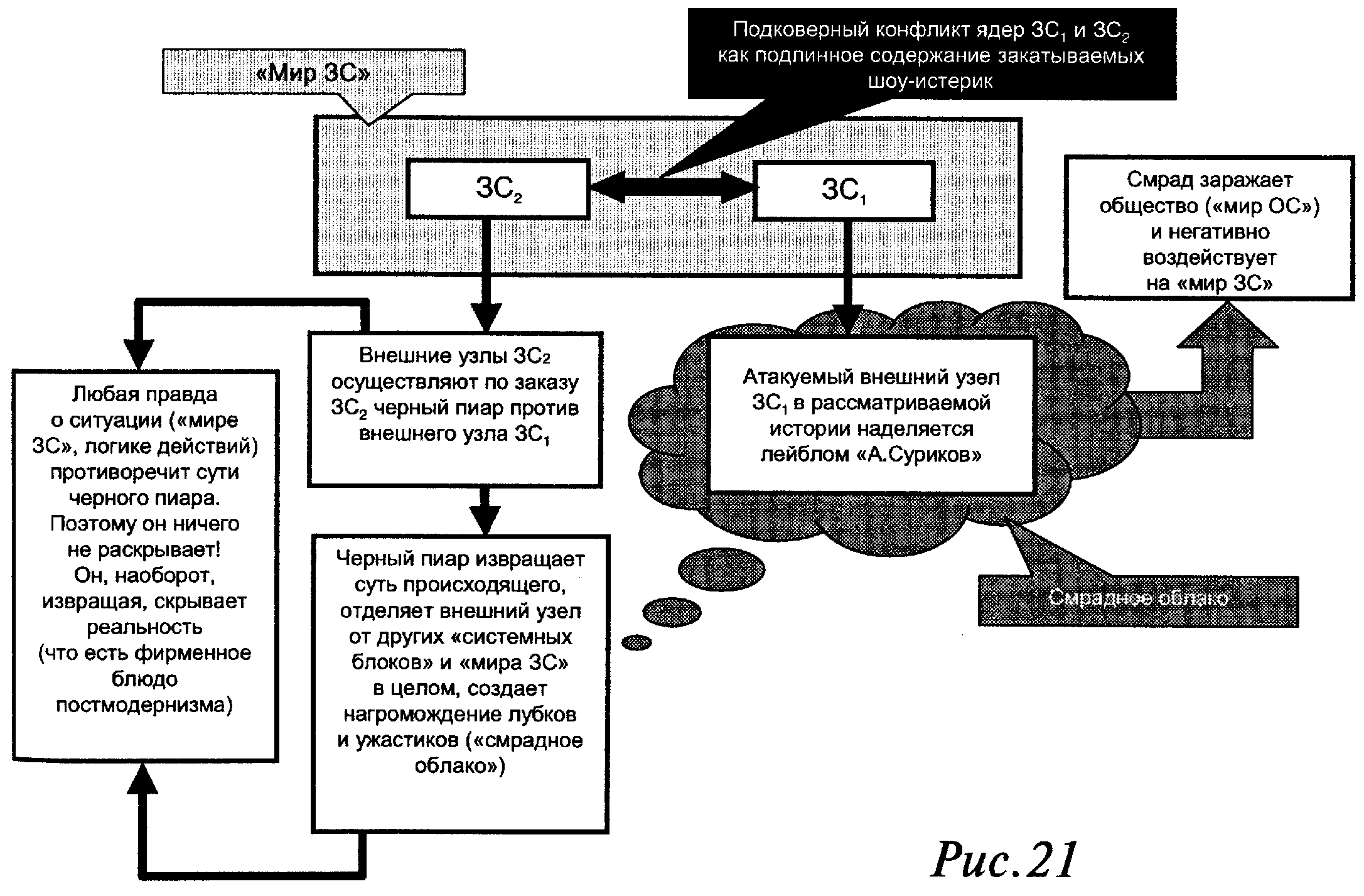 Идеологическое поле невозможно без мифов. Мифы начинают сращиваться с компроматами, а компроматы – с мифами. Образуются «мифо-компра» и «компро-мифы». Гнойная постмодернизация нарастает лавинообразно. Гибриды компры и мифов кривляются, гниют, засоряют идеологическую среду. Драка в «мире ЗС», нарушающая норму ЗС («слив», «засветка»), порождает несоразмерные процессы в сфере как бы открытой идеологии. Протуберанцы грязи, порожденные этой дракой, насыщаясь идеологическими спорами, разрастаются. А идеология гибнет не родившись. Оставить это без внимания – значит, проявить полное безразличие к судьбе идеологического процесса. А, между прочим, эта судьба синонимична судьбе мира. По крайней мере, я так считаю. И выше уже показал, почему считаю. Таково влияние на идеологию. А на профессиональную нравственность? На ответственность описания? Все это подвергается катастрофической эрозии. На месте ответственного слова возникает мешанина, выдаваемая за журналистские расследования. В этой бурде тонут последние остатки смыслов. Отборные азефы называют себя бурцевыми, дерзко претендуют на разоблачения могущественнейших мафий. Тон разоблачений трусливый, жалкий и глупый. Понятно, что не то что на могущественную мафию, а на дядю Васю с монтировкой такой пацан-разоблачитель не полезет. Стоп! После подобных констатации вроде бы напрашивается вопрос: если все так жалко и глупо, зачем в это всматриваться? Если все так специфически пахнет, зачем, так сказать, нюхать неаппетитное? Есть две причины. Об одной из них я уже говорил. Налицо определенная ситуация на рынке объяснений происходящего. Существует повышенный спрос на «ненормативные описания». Этот спрос вызван тем, что политические коллизии все больше погружаются в «непрозрачное». А значит, нормативные описания, апеллирующие к «прозрачному», транспарентному, так сказать, обессмысливаются. Отсюда – спрос на альтернативные описания. Спрос нарастает. И, даже если все альтернативное будет невыносимо грязным, это нарастание спроса востребует самые грязные описания. Грязь – на то и грязь, чтобы внутри нее завелась зараза Потребители грязи неминуемо заразятся. И сами станут разносчиками заразы. Как вы относитесь к тем немецким интеллектуалам, которые фыркали в конце 20-х годов, видя, как «Майн кампф» или «Протоколы сионских мудрецов» обретают безумную востребованность? Почему эти интеллектуалы фыркали, а не анализировали генезис и структуру подобного спроса? Почему они фыркали, а не выступали в качестве альтернативного источника конкурентоспособного интеллектуального предложения? Сильно ли мы ошибемся, если скажем, что это фырканье, в числе прочего ответственно за Освенцим? ' Фыркать сегодня – значит оставлять новый спрос на откуп новой грязи. И порождать новую чуму на следующем витке развития процесса. Хотите – фыркайте. Я не буду. Такова идеологическая причина, допускающая и даже требующая некоего (конечно, конфронтационного, но активного, а не пренебрежительного) взаимодействия с облаком лубков. Но есть и другая, аналитическая, причина. Аналитика «засветок» предполагает, что качество этих «засветок», последовательность их вброса, логика взаимосвязи между «засветками» разного ранга и уровня – все это важный первичный материал. Если этим все исчерпывается, вы ничего не поймете. Но, 