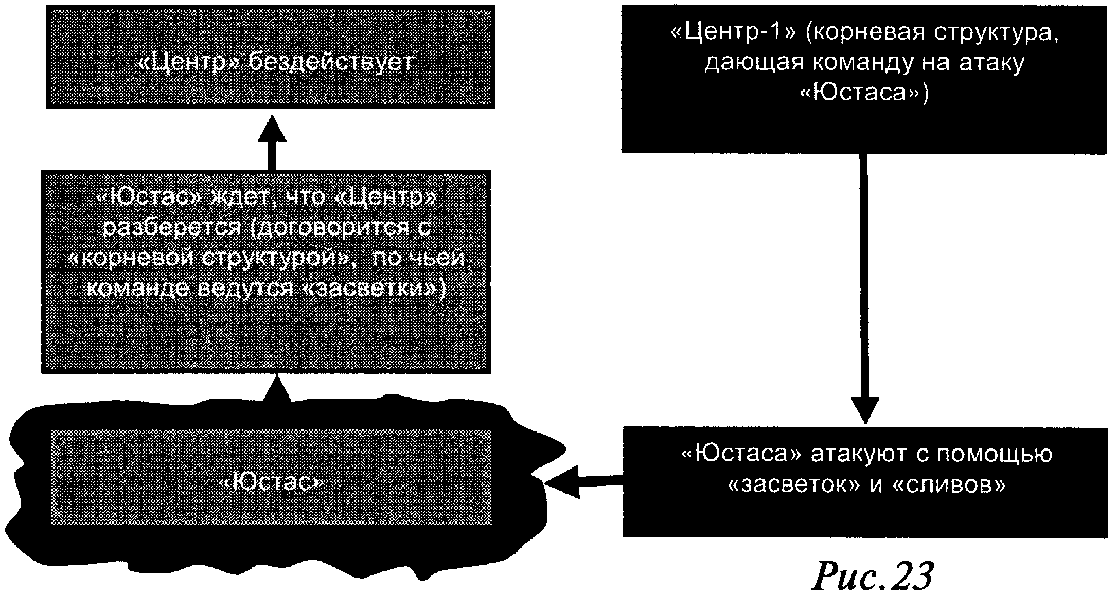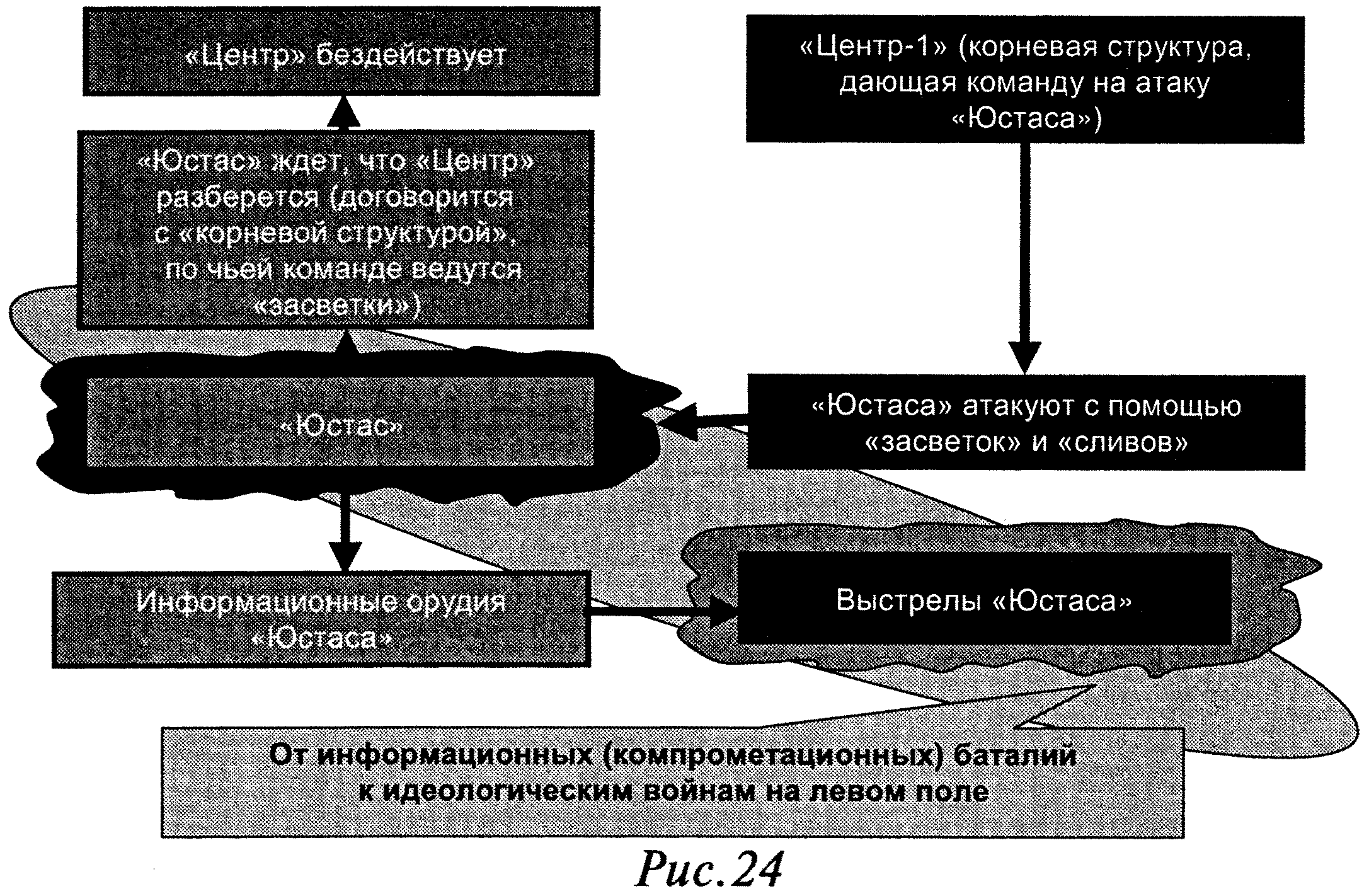 Однако «Центр» предлагает «Юстасу» автономность. То есть он говорит: «Я разбираться с другим "Центром" ради тебя не буду. Ты, если можешь, разберись... Даже неплохо, если разберешься... Но только сам». «Юстас» спрашивает: «А как я могу разобраться с чужим "Центром"? Я же «Юстас»!» Свой «Центр» говорит «Юстасу»: «А как хочешь! Не можешь? Гибни! Можешь? Выживай! Ты у нас теперь на выживании... А ты не знал?» Фигурально это напоминает только анекдот про милиционера, который несколько месяцев не приходил за зарплатой, а когда его спросили почему, ответил: «Я-то думал – дали пистолет и... вертись, как хочешь!» Короче, «Юстасу» сказали: «Вертись, как хочешь!» И предложили самому добывать пистолет. Причем не абы какой, а для войны с чужим «Центром» при бездействии собственного. Что делает «Юстас»? Он вертится. То есть начинает создавать свои орудия информационной войны (например, интернет-сайты). И палить... ну, не в корневые структуры, а так, кое-куда. Ведя ответную войну (фактически на свой страх и риск, но, в любом случае, балансируя на грани открытого и закрытого), «Юстас» как бы посылает мессидж: «Центр и Центр-1, вы когда-нибудь разберетесь друг с другом? Возникнет этот... как его... консенсус элит? !!» «Центр-1», естественно, молчит. Но и «Центр» молчит. Возможно, они молчат по сугубо конкретной причине. Но есть и причина общая. И именно наличие этой общей причины придает коллизии масштаб. Эта общая причина такова: как минимум, в нашем «мире ЗС», при его существующем качестве, нет места арбитражу и арбитру. В самом деле, арбитром не может быть никакая формальная структура, никакой Совет Безопасности. Им может быть только ОБЯЗАТЕЛЬНЫЙ И ОДНОВРЕМЕННО НЕФОРМАЛЬНЫЙ СОВЕТ ПО «ЗС-ной» ЭТИКЕ. Если бы такой Совет был, то не было бы безобразий и был бы этот самый консенсус элит. Итак, если бы был такой Совет... Но его нет и не может быть по разным причинам. Я их разберу в другой раз. А тут лишь повторюсь: «Если бы у моей тети были колеса, то была бы не тетя, а дилижанс». Но раз есть тетя, а не дилижанс, то нет и Совета по ЗС-этике. А раз его нет, то никто не помешает «засветить» сюжет из «мира ЗС». И не только «засветить»! Но и сомнительным образом состыковать это с идеологией. Так война «Юстаса» с врагами превращается в «междуусобную войну неких левых сил». Во все это втягивается идеология... Что дальше? Кто больше? (рис.24).