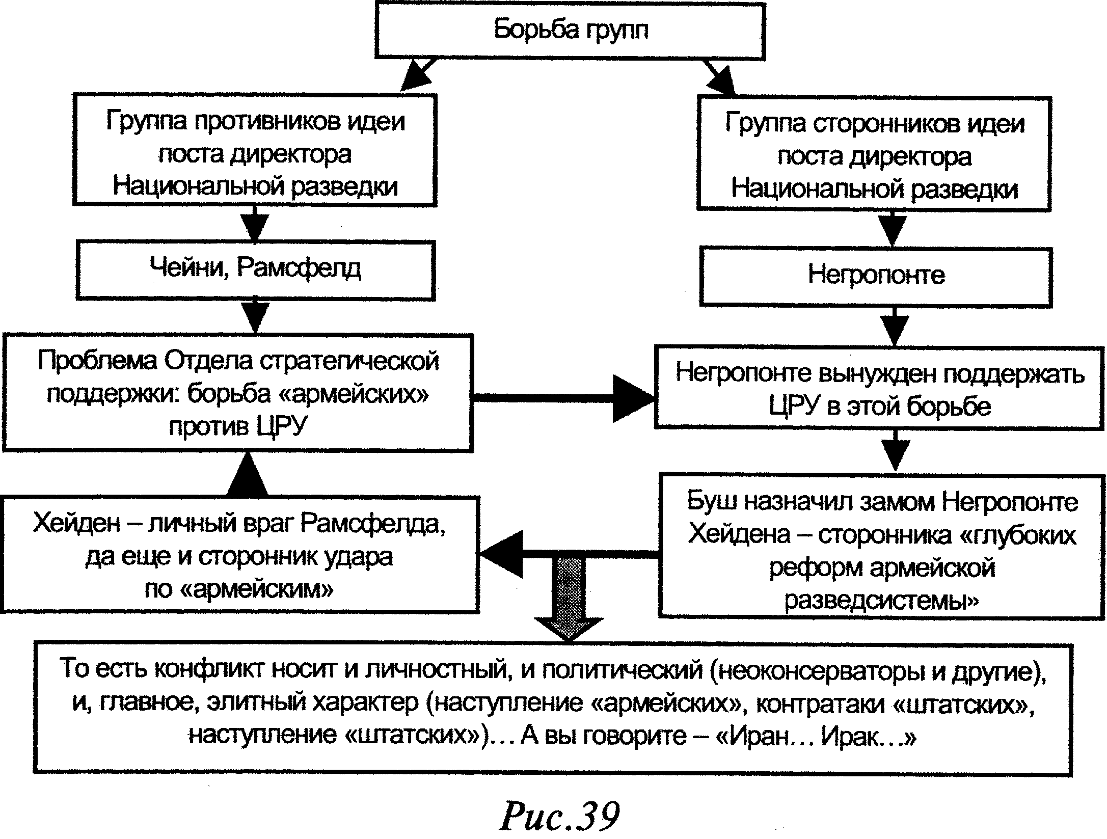 Для того чтобы произвести необходимые уточнения, нужно разобраться с теми конфликтами, которые волнуют соответствующие элиты США намного больше войн в Иране и Ираке. Один из этих конфликтов – война между Пентагоном и ЦРУ, которая началась из-за создания внутри Пентагона нового разведподразделения – Отделастратегической поддержки, фактически дублирующего функции ЦРУ. В январе – феврале 2005 года «Вашингтон пост» опубликовала серию материалов о новой службе. В результате утечек (ох уж, эти утечки!) шефу этого самого Отдела стратегической поддержки полковнику Джорджу Уалдроупу пришлось уйти в отставку. Негропонте просто вынужден будет встать на сторону ЦРУ. Если он не захочет этого сделать, то ему напомнят, кто был поставлен к нему в качестве заместителя. Это генерал-лейтенант Майкл Хейден, ранее исполнявший обязанности главы Агентства национальной безопасности АНБ (забегая вперед, укажем, что в момент, когда писалась эта книга, Хейден заменил на посту директора ЦРУ Портера Госса). Эксперты по американской элите утверждают, что между Майклом Хейденом и Дональдом Рамсфелдом имеет место давний, системный и крайне острый конфликт. Хейден, по сути, «заточен» на то, чтобы самым разрушительным образом реформировать всю армейскую разведку. То есть, конфликт носит далеко не личный характер. Что резко уточняет схему (рис.39).