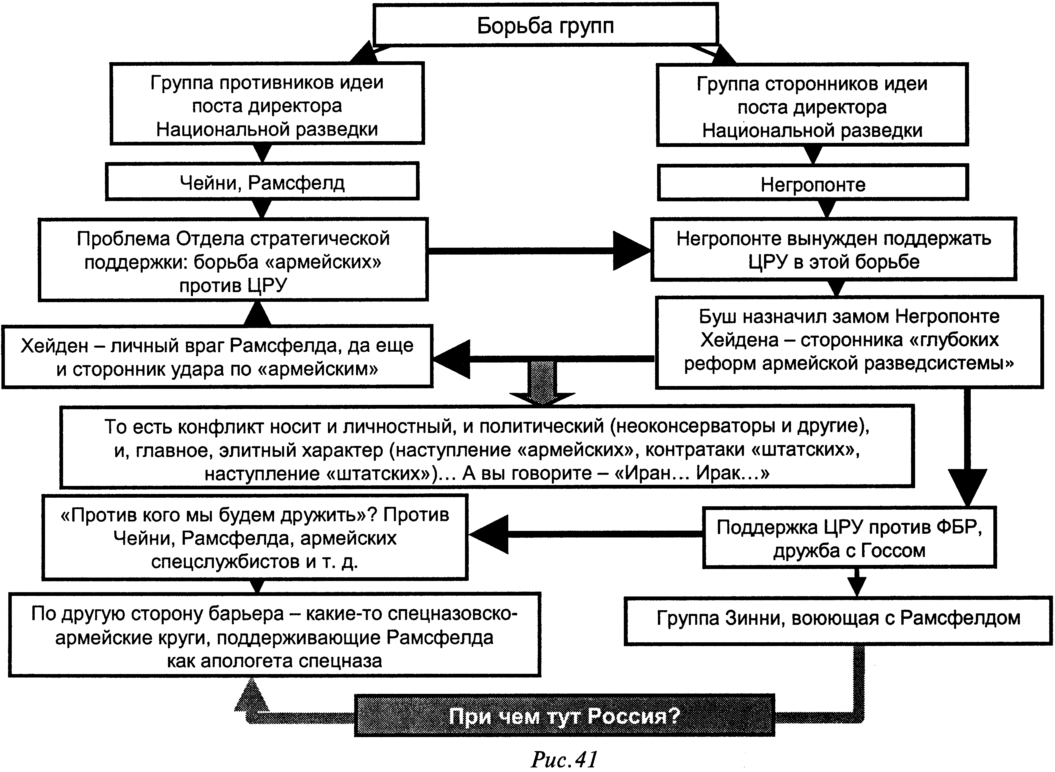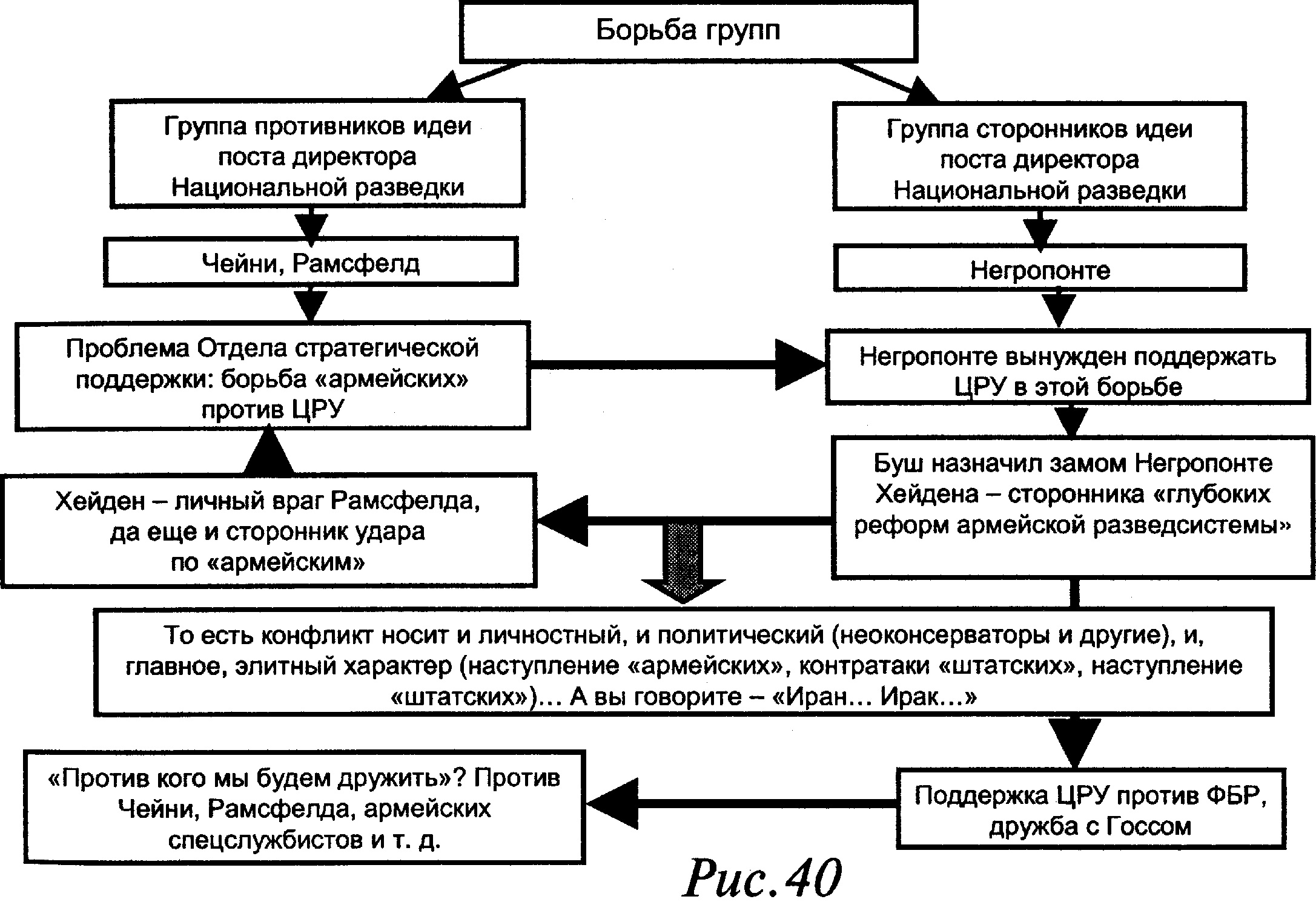 Помимо интриги с Отделом стратегической поддержки, а также всего, что из этого вытекает, Негропонте придется заниматься еще одной интригой. А именно – отношениями между ФБР и ЦРУ. ФБР хочет нарушить монополию ЦРУ на ведение агентурной разведки. Это для определенных кругов американской элиты тоже вопрос, по отношению к которому злоключения в каких-то там Ираке и Иране просто меркнут. Ибо это вопрос о власти в США. Чью же сторону займет Негропонте? Сейчас это трудно предсказать однозначно. Но... Во-первых, налицо примеры достаточно глубокого взаимодействия между Негропонте и (теперь уже бывшим) директором ЦРУ Портером Госсом. Во-вторых, Негропонте уже объединился с ЦРУ по вопросу о претензиях «армейских сил». Вряд ли он захочет оказаться под ударом коалиции из ЦРУ и «армейских сил», встав на сторону ФБР. Скорее, ситуация побудит «царя разведки» вновь поддержать ЦРУ. И что же получается в случае, если все наши выкладки справедливы? А вот что (рис.40).