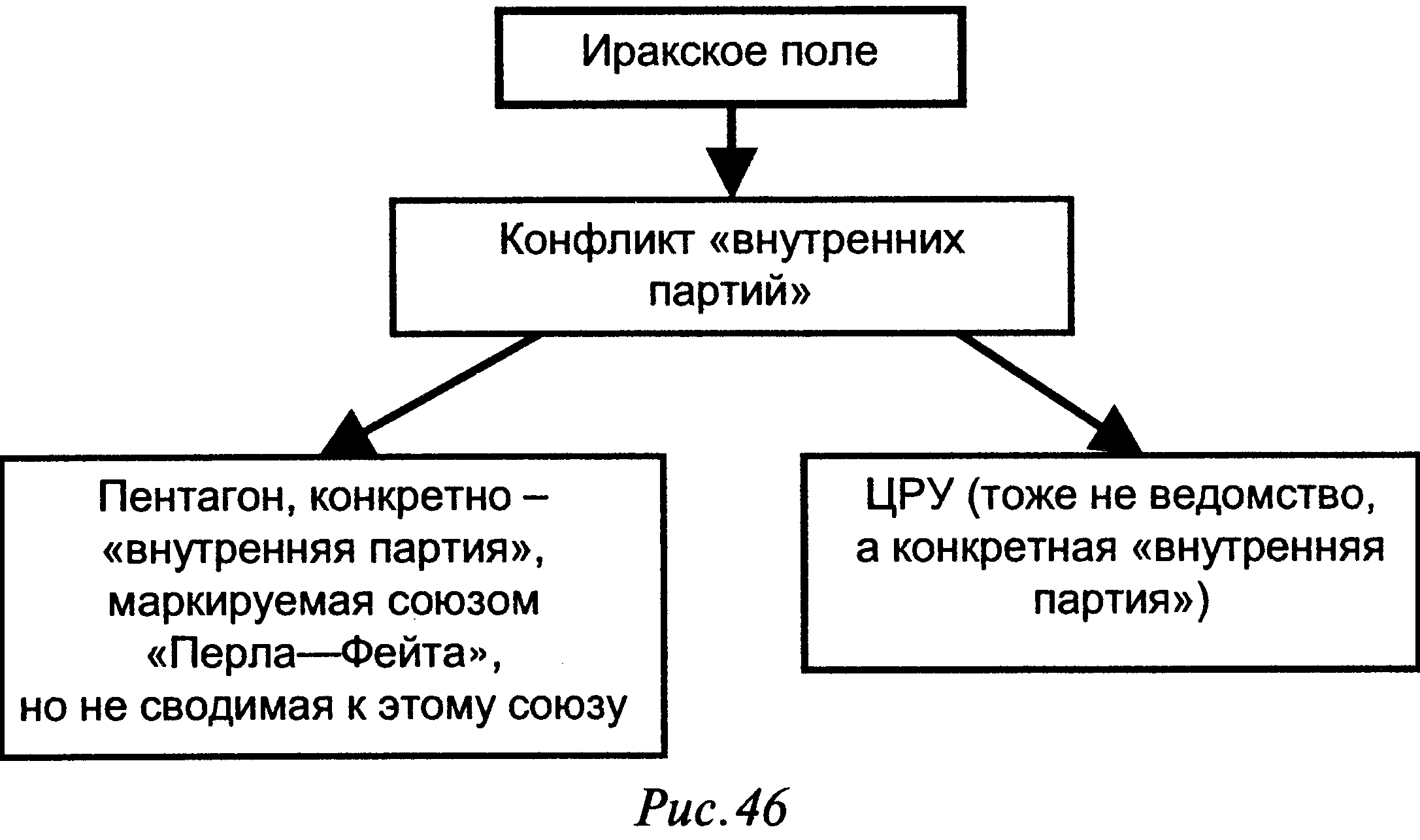 Выдержка №8 – или о том, как внутренние элитные американские партии играли на поле войны в Ираке 29 октября 2002 года сразу в нескольких американских изданиях появились разоблачения Пентагона. До начала войны оставалось менее месяца. В чем обвиняли Пентагон? В нарушении регламента. Конкретными нарушителями были Ричард Перл и его Совет по оборонной политике. При чем тут Пентагон? Дело в том, что Совет был близок к руководству Пентагона вообще, и особо близок к Дагласу Фейту, заместителю министра обороны по политическим вопросам. В чем было нарушение регламента? В том, что Рамсфелд и Вулфовиц создали в Пентагоне, в офисе Дагласа Фейта (то есть под крылом Перла и его Совета по оборонной политике), собственную разведструктуру с целью составления своих собственных (внимание!) – абсолютно независимых от ЦРУ – аналитических материалов по Ираку. Разведведомства всегда конкурируют. Эта конкуренция всегда обостряется перед началом войн. В данном случае привлекли внимание детали. А также оценки экспертов. Короче, что-то подсказало нам: дело не в обычном межведомственном конфликте. А в борьбе внутренних партий. Да, борьба велась на иракском поле. Но такая борьба всегда перетекает с одного поля на другое. А что если ответы на иранские вопросы связаны с логикой этой борьбы? Весьма влиятельные американские издания настаивали на том, что (прямая цитата) «Пентагон и ЦРУ вступили в отчаянные дебаты по поводу разведывательных данных, предназначенных для формирования американской политики в отношении Ирака». Итак, был прямо обозначен конфликт двух «внутренних партий» (рис.46).