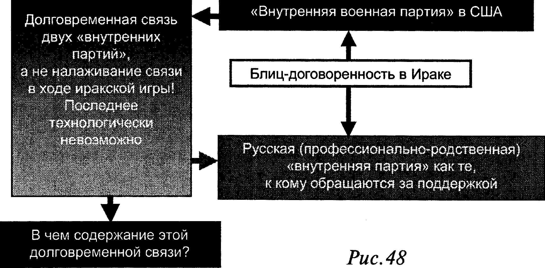 Выдержка №11 – или о том, куда ведет взятый нами иракский след Внутри выдвинутой нами гипотезы есть технологическая подсказка. Русская военная партия не могла построить отношения с американской военной партией за 2 недели! Отношения, в рамках которых возможны такие договоренности, требуют других временных сроков. Если такие договоренности осуществлялись, то лишь как очередная фаза в развитии долговременного диалога двух «внутренних партий» (рис.48).