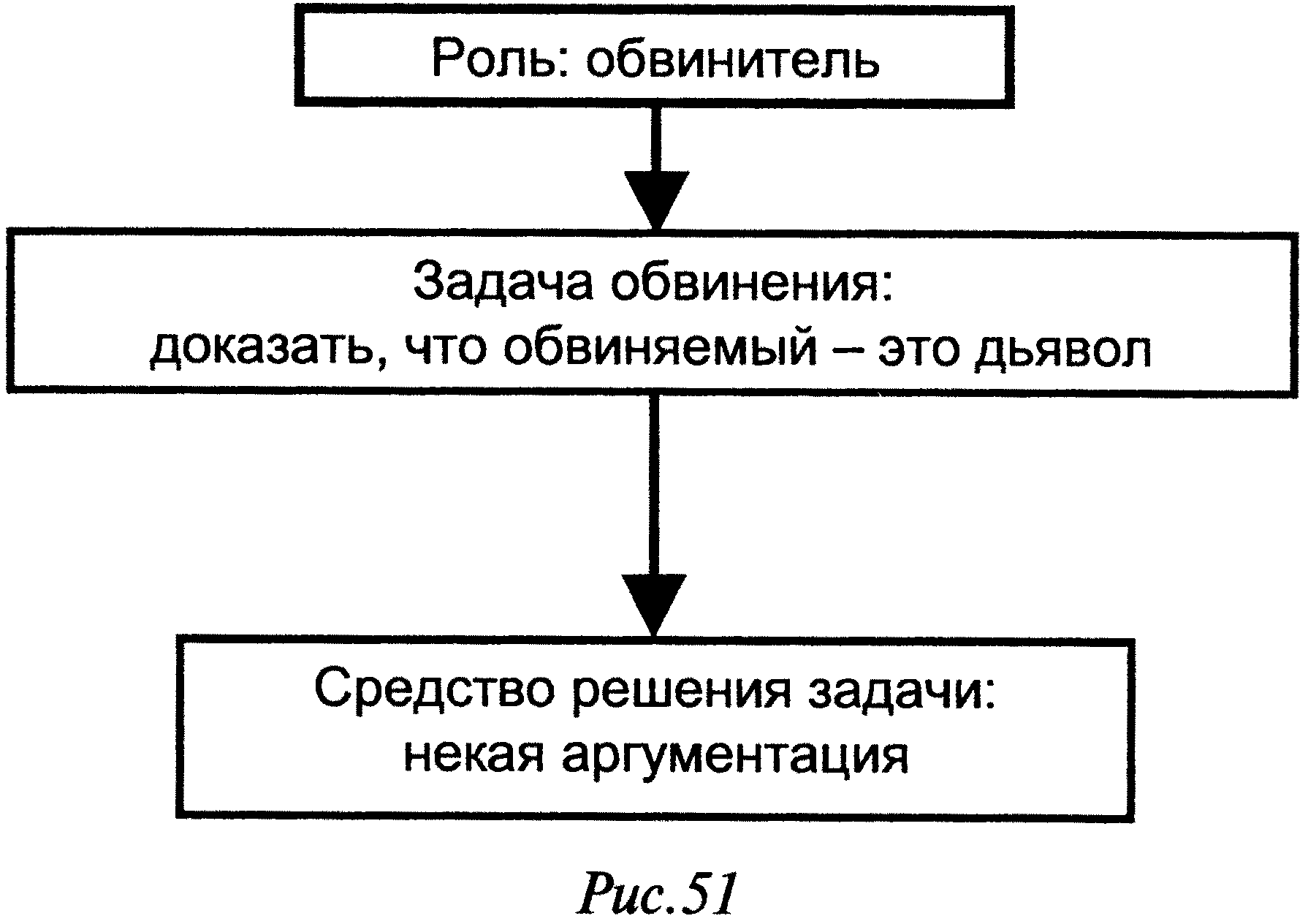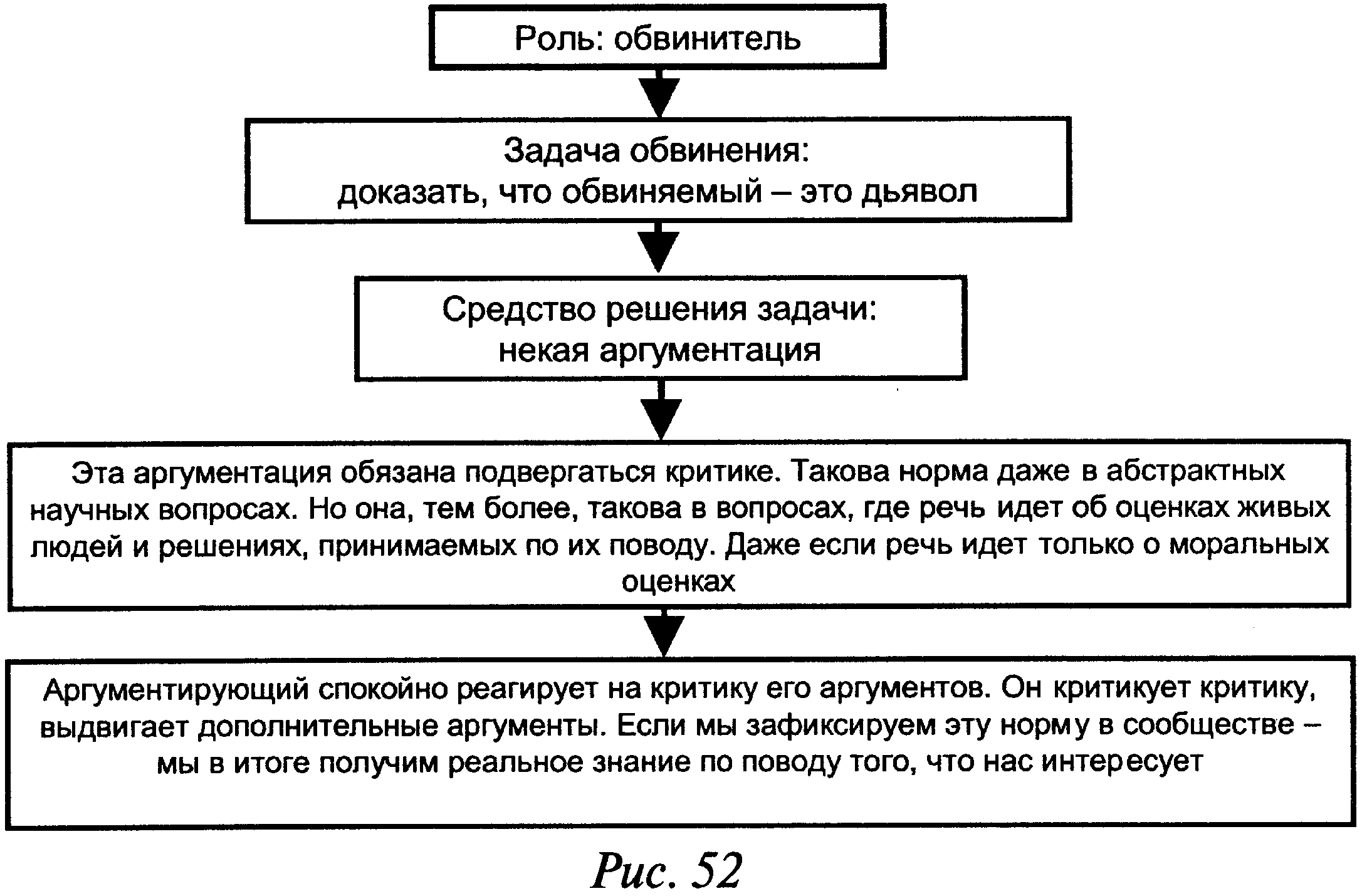 Предъявленная схема не содержит в себе ничего возмутительного. Замените слово «дьявол» на слово «злодей»... В конце концов, аналитики, которых я разбираю, и не используют слово «дьявол»... А я сам ввожу это слово для необходимых мне пояснений... Итак, введем слово «злодей»... Есть злодеи? Есть. Надо расследовать их злодейства? Надо. Так что не нравится? Не нравится не сама идея расследовать чьи-то злодейства. И не расследование конкретных злодейств. В конце концов, почему бы их не расследовать. Не нравится качество аргументации. И именно к ней адресуются претензии. А почему бы их не иметь? Один ученый (если речь идет об истине, то любой исследователь – это ученый) аргументирует. Другой критикует аргументацию. И это нормально. Только так и ищется истина в современном мире. И если мы ищем истину и устанавливаем правила, то мы должны в этих рамках и оставаться (рис.52).