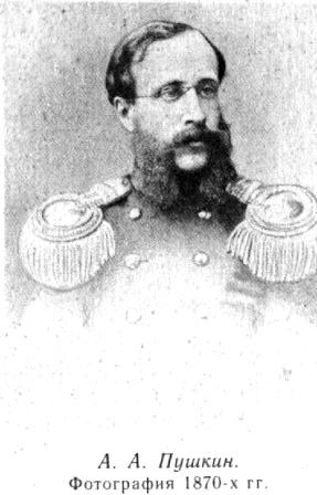 В 1863 году у А. А. Пушкина после трех дочерей наконец родился сын Александр. Вскоре семья полковника в отставке Александра Пушкина переселяется из Петербурга в Москву. В 1867 году А. А. Пушкин, вернувшийся на военную службу, направляется в распоряжение командующего войсками Виленского военного округа. Он назначается членом комиссии по крестьянским делам при виленском генерал-губернаторе. В 1869 году полковник Пушкин прикомандировывается к 14-му драгунскому Малороссийскому полку для «ознакомления со строевой службой». На фотографии Штрауса и Суревича, относящейся к 1869 году, Александр Александрович запечатлен в пору зрелости. Он носит висячие бакенбарды; открытый лоб, удлиненный овал лица, форма носа несомненно напоминают черты отца. Густые эполеты украшают полковничий сюртук. Интересно, что эту фотографию принес в Пушкинский дом в 1927 году камердинер Александра Александровича. Вариантом этого портрета является фотография Бранденбурга, сделанная в Петербурге в конце 1860-х годов, — полковник Пушкин снялся в несколько ином повороте, позволяющем лучше видеть фамильное сходство старшего сына Пушкина. Этот портрет также находится в уже упоминавшемся альбоме фотографий, принадлежавшем ранее семье Гончаровых. Летом 1870 года Александр Александрович Пушкин был назначен командиром 13-го Нарвского гусарского полка, который стоял в то время в Вильне. Полк был очень доволен этим назначением. «Сын известного поэта, именем которого гордится Россия, полковник Пушкин являл собой идеал командира-джентльмена, — писал историк полка. — …При нем полк после долгого мирного перерыва встретился со своими давнишними знакомыми турками». В 1871 году Александр Пушкин был награжден орденом Анны II степени и знаком отличия «За поземельное устройство бывших государственных крестьян».