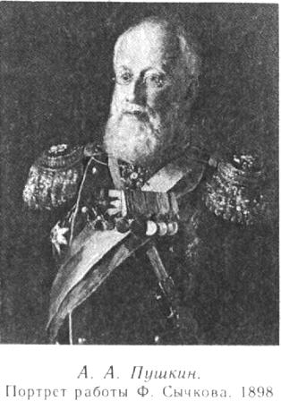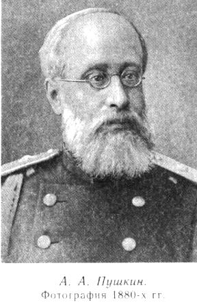 В гусарском доломане, с орденом Анны на шее и медалью «За участие в крестьянской реформе» и двумя знаками «За … введение в действие положений…» 1861 и 1863 годов на левой стороне груди снят в начале 1870-х годов полковник Пушкин. Старшему сыну поэта тридцать девять — сорок лет. Такие маленькие, овальной формы любительские снимки часто делались для иллюстрирования истории полков или просто на память офицерам для помещения на общее паспарту. Фотография хранилась у второй дочери А. А. Пушкина — Марии Александровны (впоследствии Быковой). Так же, как и на снимке Штрауса и Суревича, Александр Александрович в пенсне, с бакенбардами; умное, спокойное, с едва заметной мягкой полуулыбкой лицо несомненно напоминает А. С. Пушкина. Фотографию передал в Пушкинский дом в 1932 году Г. А. Рогозовский (возможно, потомок сослуживца А. А. Пушкина). Очень близок по времени к маленькому любительскому снимку и парадный портрет А. А. Пушкина, сделанный в Вильне в фотографии А. Штрауса и И. Бржозовского. Награды и знаки отличия на груди полковника те же самые, на доломане-мундире видна перевязь лядунки (патронташа). Эти снимки завершают ряд портретов молодого Александра Александровича. Полк Пушкина в 1875 году перешел из Вильна в местечко Яново Люблинской губернии, откуда 5 мая 1877 года, быстро окончив мобилизацию, выступил по направлению к турецкой границе. Во время долгих стоянок полка в Вильне и Янове А. А. Пушкин ездил в Москву для устройства своих дел. Детей своих Александр Александрович поручает брату. «Дела мои и детские в порядке, — сообщает он Григорию Александровичу, — пока они будут в Лопасне под охраной сестры Маши» (в 1875 году умерла жена А. А. Пушкина — Софья Александровна). Александр Александрович просит брата писать ему в действующую армию, предполагая, что они «идут в Валахию, к Букарешту». 5 июня 13-й Нарвский гусарский полк перешел границу и 29 июня переправился через Дунай. «6 октября, в виду грозных Балкан, — пишет историк полка, — после многотрудной разведывательной и сторожевой службы он участвовал в деле при деревне Турога… 22 ноября в сражении при деревне Косарево, а затем в преследовании неприятеля от Елены и взятии города Беброво… Среди боевых тревог застал его 1878 год; в окрестностях деревни Котла сражался и поражал он векового врага, проливая кровь за братьев славян. 12 октября грозные Балканы остались позади; турецкое могущество было сломлено, 9 апреля 1879 года полк прибыл обратно в Россию и стал в городе Козлове Тамбовской губернии». Немало боевых подвигов совершил А. А. Пушкин в священной войне болгар против турецких поработителей; его полк входил в отряд под командованием генерала Столетова, именем которого названа вершина легендарной Шипки. За отвагу и мужество, проявленное в русско-турецкой войне 1877–1878 годов, Александр Александрович был награжден золотым оружием с надписью «За храбрость». В конце 1879 года «за отличие, оказанное в делах против турок в окрестностях г. Котла», А. А. Пушкин получил орден Владимира IV степени с мечами и бантом. Наступил 1880 год. 6 июня в торжественной обстановке был открыт памятник Пушкину в Москве. В связи с подготовкой к его открытию член комиссии по проведению пушкинских торжеств Ф. П. Корнилов попросил старшего сына поэта дать сведения о детях Пушкина. Отвечая ему, Александр Александрович написал, что он «живет: 