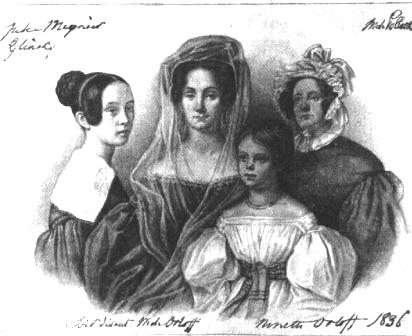 Чрезвычайно интересны в альбоме две портретные групповые зарисовки семьи Орловых-Раевских. Первая из них относится к 1836 году. В центре этой группы величественная Екатерина Николаевна Орлова, она в красивом, модном, открытом зеленом платье, с прозрачным шарфом на голове. Рядом с нею сидит ее десятилетняя дочь Анна (близкие звали ее Нинеттой), белокурая, голубоглазая девочка, будущая княгиня Яшвиль, любимица семьи. Справа и слева от матери и дочери — пожилая англичанка, воспитательница детей Орловых, и молодая привлекательная девушка с грустным выражением лица, воспитанница или компаньонка. На другом групповом портрете, сделанном в Москве в марте 1841 года, автором которого, по всей вероятности, является Николай Михайлович Орлов, изображены Михаил Федорович Орлов и его жена Екатерина Николаевна. Здесь же Николай Михайлович нарисовал и себя, и свою сестру — пятнадцатилетнюю Анну-Нинетту.