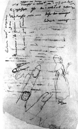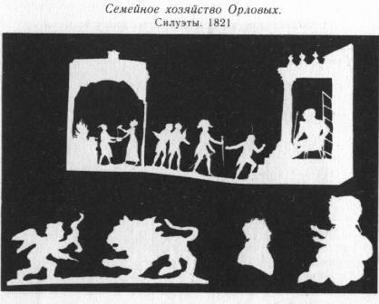 Серия силуэтов из белой бумаги на тему сватовства и женитьбы генерала М. Ф. Орлова на Екатерине Раевской чрезвычайно интересна. В силуэтах выражено отношение обеих семей к этому важному событию; в каждой сценке отражается характер вступающих в брак, каждое силуэтное изображение имело особый смысл для окружающих. Силуэты в определенном порядке наклеивались на альбомный лист. Первая серия силуэтов датирована: «Janvier 1821» (января 1821), сбоку приписано: «Catherine Rai'evsk… Michel Orloff». M. Ф. Орлов совсем недавно назначен дивизионным командиром 16-й пехотной дивизии 2-й армии, расквартированной в Молдавии. Первые шесть силуэтов относятся к периоду сватовства Михаила Федоровича Орлова к Екатерине Раевской: 1) Екатерина Николаевна поливает из бутылки Михаила Орлова, стоящего под балконом, очевидно, охлаждая его пыл. 2) Она же, стоя перед туалетом, украшает прическу, за нею со щеткой в руках стоит Михаил Федорович. 3) М. Ф. Орлов, стоя на одном колене, держит на руках перед Екатериной Раевской моток ниток. 4) Екатерина Николаевна с пучком розог в руке бежит к стоящему на колене Михаилу Федоровичу. 5) Михаил Орлов сидит за роялем, очевидно, сочинил мадригал или романс в честь невесты; с листом в руке от рояля устремляется в сторону Александр Раевский. 6) Мария Раевская разговаривает или обсуждает что-то с мадам Могилинской, служившей по всей вероятности, в доме Раевских домоправительницей. На обороте этого же листа большой силуэт, семейное хозяйство М. Ф. Орлова. Условно изображены парадное крыльцо — портик дома Орловых в Кишиневе — и расположенная напротив кухня. Михаил Федорович, сидя на крыльце, принимает посетителей. В кухне Екатерина Николаевна Орлова льет что-то в сосуд, находящийся в руках повара. Подчеркивается общественный вес и демократичность генерала Орлова, с одной стороны, и хозяйственные способности его молодой жены — с другой. Внизу листа символическое изображение Михаила Орлова в образе мощного льва, в которого амур уже выпустил из лука свою стрелу. Рядом силуэтный портрет Густава Олизара и младенца; судя по надписи, это десятимесячная дочь Орловых Анна-Нинетта (последний силуэт относится уже к 1827 году). События, так талантливо изображенные в силуэтах, происходят на глазах у Пушкина. В конце января 1821 года он приезжает в Киев и живет у Н. Н. Раевского-старшего, общается с членами его семьи, с М. Ф. Орловым, помолвленным с Екатериной Раевской. Только в середине февраля он уезжает вместе с братьями Давыдовыми из Киева в Тульчин; с весны 1821 года поэт живет в Кишиневе, куда была переведена канцелярия его начальника Инзова и куда приехал с женой Орлов. Вот как описывает эти месяцы жизни Пушкина П. В. Анненков в своих «Материалах для биографии Пушкина»: «Начало 1821 года застало его уже в самом Киеве, как свидетельствует стихотворение «Морской берег»[17], под которым выставлено в оригинале: «8 февраля 1821. Киев». Мы знаем, что в это время генерал Раевский, под покровительством которого состоял Пушкин, праздновал в Киеве семейную свою радость. Пушкин снова возвращается опять в поименованную нами деревню (Каменка, имение Давыдовых. — Авт.) и 20 февраля кончает там «Кавказского пленника». Посвящение поэмы и эпилог к ней написаны гораздо позднее (в мае месяце) и уже в Одессе… В начале весны 1821 года Пушкин снова является в Кишинев вместе с одним из чиновников М. Ф. 
