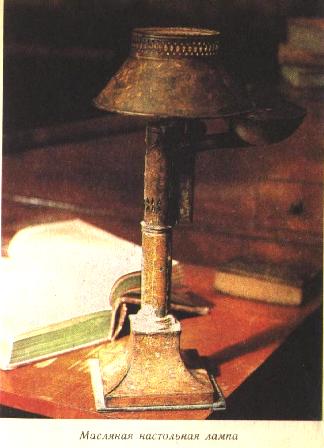 Это, прежде всего, жестяная настольная масляная лампа с масленкой полусферической формы, высоким цилиндром с вкладышем для фитиля и решетчатым колпаком-абажуром. Лампа расписана коричневой краской с золотом, словно морозными узорами. Когда в 1880 году в Петербурге организовалась пушкинская выставка, Григорий Александрович передал ее устроителям выставки с такой аннотацией: «Лампа Пушкина, при свете которой он работал в с. Михайловском». Уезжая из Михайловского в 1899 году в Маркутье, Г. А. Пушкин оставил лампу своей сестре А. П. Ланской-Араповой, и уже на юбилейной пушкинской выставке 1899 года эта реликвия выставлялась как ее собственность. А. П. Арапова завещала лампу Пушкинскому дому. После ее смерти лампа некоторое время хранилась в музее при Археологическом институте в Петербурге (б. дом Шереметевых на Фонтанке) и в 1919 году передана хранителем музея Н. Пиотровским «по принадлежности» в Пушкинский дом. В сопроводительном письме на обороте фотографии лампы Пиотровский изложил ее историю. В настоящее время лампа находится в кабинете А. С. Пушкина в его последней квартире.