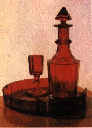 Прибор рубинового стекла с золочением по граням, состоявший из графина с притертой пробкой, четырех рюмок и подносика с бортиком, был вместе с Пушкиным во время его ссылок на юг и в Михайловское. История этого прибора изложена в письме племянника Пушкина, Льва Николаевича Павлищева: «Пушкин… купил его вместе с принадлежностями, а именно, четырьмя рюмками (три из них позднее были утрачены. — Лег.) и подносом в Кишиневе, в 1822 году, когда поэт находился на службе при новороссийском генерал-губернаторе Инзове в качестве чиновника Попечительного комитета о колонистах южной России. Из этого графина мой дядя наливал в те же рюмки и себе и посещавшим его знакомым любимое свое вино мадеру и хранил весь прибор, как воспоминание о Кишиневе, у себя, до замужества в 1828 году своей сестры, покойной моей матери; тогда-то он и подарил ей означенный прибор по случаю ее свадьбы, наполнив при этом графин той же любимой поэтом живительной влагой. Затем весь прибор — графин, рюмки и поднос — моя мать, Ольга Сергеевна Павлищева, подарила мне в 1856 году, когда я окончил курс наук в С.-Петербургском университете, ректором которого в то время, — кстати замечу, — был друг поэта — покойный Петр Александрович Плетнев, и я счастлив, что мог преподнести этот графин многоуважаемому Ивану Леонтьевичу — искреннему почитателю угасшего достославной памяти Пушкина… 1902 г. Лев Павлищев». В 1911 году известный пушкинист Б. Л. Модзалевский, в качестве душеприказчика скончавшегося тогда же в Кисловодске писателя И. Л. Леонтьева (Щеглова), передал Пушкинскому дому «по завещанию покойного» графин и рюмку рубинового стекла, принадлежавшие некогда Пушкину. В том же году К. В. Рышкова и ее отец В. Ф. Рышков передали туда же и поднос. В наше время этот прибор можно увидеть в одной из комнат квартиры А. С. Пушкина на Мойке, 12.
