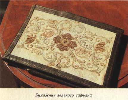 Сафьяновый бумажник. В развернутом виде он имеет форму четырехугольника со срезанными углами. Зеленый сафьян украшен полосками золотого тиснения, а на лицевой части, как в раму, вставлена вышивка разноцветной синелью на белом шелке. Бумажник легко складывается и закрывается на металлический замочек. Приехав последний раз в Москву в мае 1836 года, Пушкин остановился у Павла Воиновича и Веры Александровны Нащокиных, живших тогда в доме Ивановой «у церкви старого Пимена» (именно этот адрес сообщает поэт своей жене в письме от 4 мая из Москвы). Через много лет В. А. Нащокина, передавая бумажник Пушкина А. А. Корзинкину, писала: «Удостоверяю, что подаренный мною глубокоуважаемому Александру Андреевичу Корзинкину старинный зеленого сафьяна с шитьем из шелка бумажник принадлежал, в свое время, незабвенному поэту А. С. Пушкину и перешел к его другу, к моему покойному мужу, Пав. Воин. Нащокину при следующих, насколько я припоминаю, обстоятельствах… В мае 1836 года Пушкин гостил у нас в Москве у церкви старого Пимена в доме Ивановой. Мой муж всякий день почти играл вкарты в Английском клубе, и играл крайне несчастливо. Перед отъездом в Петербург Пушкин предложил однажды Павлу Воиновичу этот бумажник, говоря: «Попробуй сыграй с ним на мое счастье». И как раз Павел Воинович выиграл в этот вечер тысяч пять. Пушкин тогда сказал: «Пускай этот бумажник будет всегда счастием для тебя». 1890 г. Сентября 3 дня. Вдова гвардии поручика Вера Александровна Нащокина». А. А. Корзинкин вскоре подарил бумажник поэта вместе с письмом В. А. Нащокиной старшему хранителю Исторического музея в Москве А. В. Орешникову. Последний в 1892 году принес эту реликвию в дар своему музею. Из Исторического музея бумажник в 1938 году поступил в Государственный музей А. С. Пушкина. Сейчас эта вещь находится в одной из комнат последней квартиры А. С. Пушкина.