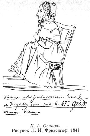 Двоюродная сестра детей П. А. Осиповой, известная Анна Петровна Керн, в своих воспоминаниях писала о ней: «Она только все читала и читала и училась. Она знала языки: французский порядочно и немецкий хорошо… Она была любящая, поэтическая, любознательная натура…» В своих письмах к П. В. Анненкову в 1859 году А. П. Керн (Маркова-Виноградская) отметила также очень важную сторону отношения своей тетки к Пушкину: «Я на днях видела брата Алексея Вульфа, который сообщил мне странную особенность предсмертного единственного распоряжения своей матери — Прасковьи Александровны Осиповой; она уничтожила всю переписку со своим семейством: после нее не нашли ни одной записочки ни одного из ее мужей, ни одного из детей!.. Нашли только все письма Александра Сергеевича Пушкина». Большая любовь П. А. Осиповой к Пушкину, как к человеку и как к поэту, была известна современникам. В альбоме два портрета П. А. Осиповой — это рисунки Н. И. Фризенгоф августа 1841 года; портреты почти без элементов карикатурности, — такой, или почти такой, знал Пушкин эту маленькую пылкую, добрую женщину. В связи с портретами Прасковьи Александровны необходимо вспомнить описание ее внешности, данное А. П. Керн для П. В. Анненкова: «Она, кажется, никогда не была хороша, — рост ниже среднего гораздо, впрочем в размерах; стан выточенный, кругленький, очень приятный, лицо продолговатое, довольно умное… нос прекрасной формы, волосы каштановые, мягкие, тонкие, шелковистые; глаза добрые, карие, но не блестящие, рот ее только не нравился никому, он был не очень велик и не неприятен особенно, но нижняя губа так выдавалась, что это ее портило. Я полагаю, что она была бы просто маленькая красавица, если бы не этот рот». В 1841 году полной, болезненной Прасковье Александровне было уже 60 лет. Н. И. Фризенгоф на своем первом рисунке представила ее сидящей в широком мягком кресле, в чепце, платье с рюшами, с табакеркой вруках. Из-под платья видна голова собачки, лежащей на подставке для ног. Во всем облике владелицы Тригорского чувствуется скованность и напряженность; художница подчеркнула недостатки ее лица и фигуры, заострив внимание на выпяченной нижней губе и преувеличенно округлых линиях тела. На втором рисунке (в профиль) П. А. Осипова также запечатлена во весь рост; ее облик вполне соответствует описанию, данному Анной Керн. Она зарисована, по всей вероятности, во время визита в Михайловское; сидя на стуле и сжимая в руках зонтик, Прасковья Александровна любезно улыбается, ее чепец и визитное платье вполне соответствуют возрасту. Под портретом ироническая надпись (на французском языке): Тригорское сравнивается с Веной и Ревелем по расположению под 47-м градусом широты. Портрет Анны Николаевны Вульф, автором которого является также Н. И. Фризенгоф, — злая и жестокая карикатура на девушку, так глубоко и искренне любившую Пушкина. Язвительная подпись под портретом: «Anqe de Triqorsky» (Тригорский ангел) — говорит о насмешливом и недоброжелательном отношении к ней со стороны окружения Натальи Николаевны. О любви Анны Николаевны к Пушкину, об искренности этой любви говорят, например, такие строки из ее письма к нему: «Вы не заслуживаете любви, мне надо свести с вами много счетов, но горе, которое я испытываю от того, что не увижу вас больше, заставляет меня все забыть… Никогда в жизни никто не заставит меня испыты