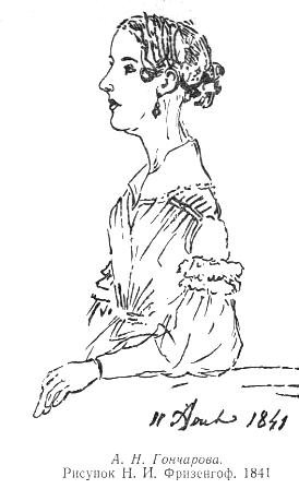 На предполагаемом портрете Марии Ивановны Осиповой, дочери П. А. Осиповой от второго брака (1820–1895), мы видим стройную высокую молодую девушку с характерным профилем, изображенную в движении, почти без всяких элементов карикатурности; чувствуется, что эта добрая, веселая, энергичная девушка была в жизни именно такой, какой Н. И. Фризенгоф изобразила ее на альбомном листе; от всего ее облика веет свое образной прелестью. Пушкин знал Марию Ивановну девочкой-подростком. В письме падчерице Осиповой — Александре Ивановне Беклешевой из Тригорского в Псков (сентябрь 1835 года) он так описывает свою встречу с ней: «Я пишу к Вам, а наискось от меня сидите Вы сами в образе Марии Ивановны. Вы не поверите, как она напоминает прежнее время. И путешествия в Опочку и прочая…» В 1841–1842 годах по отношению к Марии Ивановне возникло своеобразное соревнование между отцом и сыном Пушкиными: в нее был влюблен овдовевший Сергей Львович и его сын Лев Сергеевич также питал к ней самые нежные чувства. По наблюдениям О. С. Павлищевой в Петербурге, чувство ее отца к М. И. Осиповой было самым серьезным. Льва Сергеевича Машенька Осипова искренне любила, хотела стать его женой, но свадьба не состоялась по разным причинам. Замуж М. И. Осипова не вышла. К лучшим портретам из серии зарисовок Н. И. Фризенгоф в альбоме относится портрет Александры Николаевны Гончаровой (11 августа 1841 года). Свояченицы Пушкина, Александра и Екатерина Гончаровы, жили с семьей Пушкина в Петербурге с 1834 года; с этого времени они стали членами семьи поэта, непосредственными участницами трагических событий последнего периода его жизни. После выхода замуж за барона Жоржа Дантеса-Геккерна и отъезда с ним за границу Екатерины Николаевны Александра Николаевна постоянно жила вместе с женой и детьми поэта. Только в 1852 году, выйдя замуж за овдовевшего (после смерти в 1850 году Натальи Ивановны) Густава Фризенгофа, она с мужем уехала в Словакию (Австро-Венгрию), в его имение Бродяны. На предполагаемом портрете Гончаровой несомненны черты сходства с ее известным акварельным портретом из собрания Всесоюзного музея А. С. Пушкина и ее большим портретом неизвестного художника (масло на холсте) из Бродянского замка[13]. Александра Николаевна чертами лица была очень похожа на свою сестру; это сходство особенно заметно при сравнении портрета Александры Николаевны работы В. Гау этого времени, также находящегося в Бродянах, с известными портретами Н. Н. Пушкиной. На портрете в альбоме Натальи Николаевны А. Н. Гончарова несомненно несколько идеализирована. Большая симпатия со стороны Н. И. Фризенгоф сказалась на интерпретации образа «Азиньки» Гончаровой. Художница старалась изобразить своего друга как можно привлекательнее. Портрет делался, очевидно, специально, — Александра Николаевна позирует, сидя у стола.