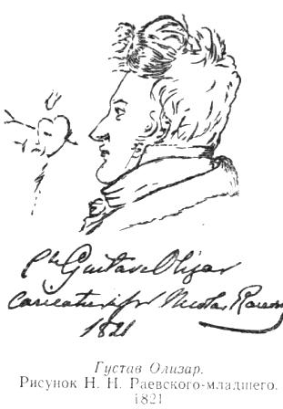 Находящиеся в альбоме портреты поэта и общественного деятеля, киевского губернского предводителя дворянства Густава Олизара уникальны. Он жил в Крыму, где встречался с Адамом Мицкевичем, посвятившим ему сонет «Аюдаг». В стихах Г. Олизар воспевал свою Беатриче — Марию Раевскую, в которую был безнадежно влюблен. Александр Пушкин общался с ним в Киеве, Кишиневе и Одессе. В послании 1824 года «Графу Олизару» Пушкин писал о том, что национальные противоречия и предрассудки не должны препятствовать общению в искусстве и что «прекрасная поэзия объединяет племена и народы». Граф Олизар был связан с польскими патриотическими кругами и привлекался по делу декабристов. Два раза он сватался к дочерям генерала Раевского: сперва к Марии Николаевне, а затем, в 1828 году, к ее сестре Елене, оба раза получил отказ. Карандашный рисунок 1821 года в профиль сделан Николаем Раевским-младшим (о чем свидетельствует подпись под рисунком); несмотря на некоторую карикатурность портрета, он дает достаточно полное представление о внешнем облике польского поэта. Второй портрет Густава Олизара — белый силуэт, наклеенный на альбомный лист между силуэтами, относящимися к женитьбе Михаила Федоровича Орлова на Екатерине Раевской в 1821 году. Этот портрет, хотя и менее выразительный, дополняет наше представление о южном знакомце Пушкина. Предполагаемый портрет Екатерины Николаевны Раевской 1817 года, в возрасте двадцати лет, также мало известен; на листе вверху ясно видна дарственная надпись старшему брату Александру. Под профильным портретом очень миловидной девушки стихотворные строки, воспевающие прекрасный характер и красоту Екатерины Раевской. В рисунке чувствуется большое желание автора как можно точнее передать черты этой необыкновенной (по определению Пушкина) девушки.