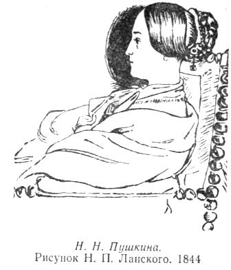 В мае 1851 года Н. Н. Ланская с дочерьми и сестрой Александрой Николаевной уехала за границу для лечения на водах, а в 1852 году Н. П. Ланской зарисовал ее в профиль для альбома Александры Николаевны Гончаровой-Фризенгоф. На этом рисунке Наталья Николаевна по-прежнему красива, моложава, но черты ее лица заострены, она худощава, и, видимо, это создаст общее впечатление болезненности, усталости. Этот рисунок Ланского, почти неизвестный в нашей стране, находится в альбоме А. Н. Гончаровой-Фризенгоф (Словацкий национальный музей). В 1855 году генерал-адъютант Ланской был назначен начальником воинского ополчения в город Вятку. Вместе с ним приехала туда и Наталья Николаевна. По дороге она простудилась, у нее распухли ноги, и для лечения был приглашен лучший вятский врач Н. В. Ионии — большой почитатель Пушкина. Его дочь Л. Н. Спасская в начале нашего века опубликовала воспоминания отца о встрече с Н. Н. Пушкиной-Ланской. Доктор увидел уже немолодую высокую женщину со слабыми следами былой красоты. Он отмечал, что в обращении Наталья Николаевна производила самое приятное впечатление сердечной, доброй и ласковой женщины и обнаружила в полной мере тот простой, милый, аристократический тон, который так ценил в ней Пушкин. В Вятке Наталья Николаевна познакомилась с молодым М. Е. Салтыковым-Щедриным, сосланным туда, по словам И. С. Тургенева, «за распространение либеральных идей». Она приняла горячее участие в судьбе писателя, окончившего, как и А. С. Пушкин, Царскосельский лицей, хлопотала об облегчении его положения и с помощью родственных связей [10] добилась желаемого — уже к концу 1855 года Михаил Евграфович был освобожден из ссылки. В 1861 году для поправления здоровья Наталья Николаевна едет за границу; особые надежды возлагались на воды Швальбаха и на теплый климат Женевы и юга Франции. Казалось, что длительное пребывание в теплых краях принесло свои плоды. Лето 1862 года Наталья Николаевна проводит в Бродянах вместе с приехавшей туда дочерью — Натальей Александровной Дубельт. Несчастье «сбежавшей» от мужа Таши способствовало ухудшению здоровья Натальи Николаевны, а воспоминания о пережитом и встреча с Александриной — живой свидетельницей ее драмы — бередили душу. В это время, по всей вероятности, венским фотографом была сделана групповая фотография: на ней запечатлены хозяева Бродянского замка — Густав Фризенгоф и его жена Александра Николаевна, их друзья супруги Берени, Наталья Александровна Дубельт (Пушкина) и на переднем плане справа в светлом модном платье чрезвычайно худая и немного жалкая пятидесятилетняя Н. Н. Пушкина-Ланская. Красота ее, вызывавшая некогда восторженное преклонение, ушла безвозвратно. Наталья Николаевна не перестает думать о России, ее тянет домой, и в 1863 году семья Ланских возвращается обратно. Летом они живут в Ивановском — подмосковном имении, доставшемся старшему сыну Натальи Николаевны, Александру Александровичу Пушкину, в качестве приданого за женой, а к осени переезжают в Петербург. Съездив еще раз в Москву на крестины внука — тоже Александра Александровича (сына А. А. Пушкина) — и простудившись в дороге, Наталья Николаевна уже больше не могла победить болезнь и 26 ноября 1863 года «скончалась в Петербурге на Екатериненском канале у Казанского моста в доме Белгарда»— эта надпись сделана на обороте ее последней