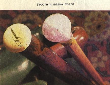 Железная палка Пушкина. Он носил ее, держа в руке или положив на плечо. Она хорошо запомнилась друзьям и знакомым поэта, жившим в начале 1820-х годов в Кишиневе или Одессе и видевшим Пушкина разгуливающим с этой палкой по городу. Иногда он подбрасывал ее вверх. Один из одесских старожилов, Михаил де Рибас, в рассказах, собранных В. Я. Яковлевым, так говорил о Пушкине этих лет: «В нем меня более всего поразили его арабский профиль… его кудрявые волосы и его тяжелая железная палка». Эта палка появилась у поэта весной 1822 года; знакомый Пушкина И. П. Липранди в своих известных воспоминаниях, говоря о дуэльных столкновениях Пушкина и о своем отъезде из Кишинева, пишет: «Когда я возвратился, то Пушкин не носил уже пистолета, а вооружался железной палкой в осьмнадцать фунтов весу». По виду палка несколько напоминает букву «Т», в сечении она круглая, с рукояткой такой же формы, к концу суживается и заканчивается четырехгранным острием. История этой вещи такова: после отъезда Пушкина из Одессы его железная палка находилась у профессора Московского университета и поэта Алексея Федоровича Мерзлякова — автора стихов, ставших народной песнью, «Среди долины ровныя…». Он в 1820-х годах жил в Одессе. Затем палка досталась поэту А. И. Подолинскому, а позднее — сыну полковника Ягницкого, бывшего адъютантом графа М. С. Воронцова [22]. Ягницкий подарил ее одесскому жителю Ивану Мартыновичу Донцову, у которого она находилась в течение почти тридцати лет. В 1880-х годах один из членов известной в Одессе семьи Тройницких, Михаил Григорьевич, получил пушкинскую палку от Донцова и в 1887 году передал ее в Одесский музей истории и древностей. В 1938 году из Одесского художественного музея (б. Музея истории и древностей) железная палка перешла в Государственный музей А. С. Пушкина. В настоящее время она экспонируется в доме-музее А. С. Пушкина в селе Михайловском [23].Тонкая, светлого дерева трость