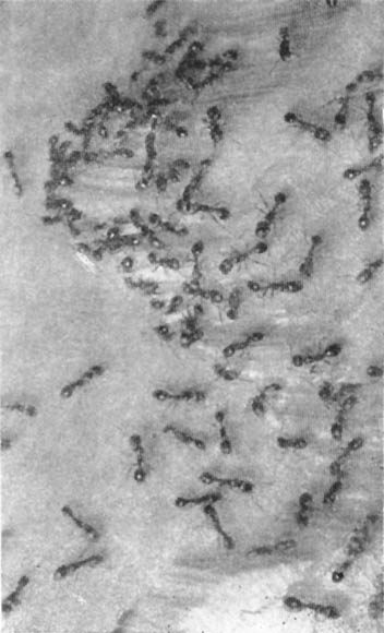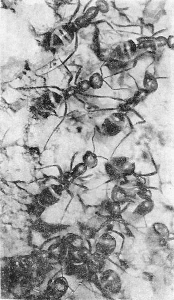 В поисках ответов на загадки жизни муравьев иногда приходится брать лопату и разрушать муравейник. Пришло время раскопать и знакомое гнездо рыжего муравья. Оно находилось возле тропинки, по которой мы ходили от бивака к ручью. Первый же взмах лопаты вызвал тревогу и ожесточенное сопротивление. Муравьи брызгались кислотой и отчаянно кусались. Разобрать надземную часть муравейника легко. Но когда очередь дошла до подземных галерей, до почвы, пронизанной густой сетью корней, дела пошли скверно. В разгар раскопок, отвалив пласт земли, я начал осторожно разбирать его руками. Показался хорошо выглаженный ход, за ним открылось почти круглое помещение величиной с грецкий орех. По всей вероятности, землей завалило в одном месте проход, и круглое помещение оказалось отрезанным от остального муравейника. Иначе как объяснить, что, несмотря на ужасную участь, постигшую муравейник, всеобщую возбужденность и растерянность, здесь, в этой круглой «зале» мирно спали, прижавшись тесно друг к другу, скрючив ноги, два десятка муравьев? Это была настоящая спальня, и только встряска и яркий солнечный свет нарушили покой отдыхавших муравьев. Один за другим они стали просыпаться, включаться в общий переполох. Только двое засонь не желали расставаться со сном и пробудились лишь, когда их потревожили палочкой. По правде говоря, зрелище спящих муравьев было для меня так неожиданно, что я сразу не понял, с чем имею дело, и решил, что натолкнулся на мертвых муравьев. Но обитатели большой камеры оказались живыми и, находясь в пробирке, не проявляли никаких признаков болезни. Не думал я, что даже сейчас, в полдень, среди муравьев найдутся спящие. Более всего рыжие муравьи активны днем. К вечеру их деятельность постепенно падает. В сумерках еще много муравьев ползает, занимаясь различными делами. Ночью жители муравейника, утомленные дневными заботами, погружаются в сон. И тогда на муравейнике можно застать несколько вяло ползающих муравьев. Это сторожа. Их назначение — не только охранять входы муравейника от непрошеных посетителей, но и вовремя поднять тревогу в случае опасности. Пробуждение происходит с первыми лучами солнца, оно значительно дружнее, чем отход ко сну. Вечером, когда поверхность муравейника, обычно усеянная деятельными муравьями, постепенно пустеет, можно увидеть странное зрелище. Из входов появляются носильщики, волокущие своих товарищей. Вытащив их наверх и побродив по жилищу, они выпускают ношу и скрываются обратно. Принесенный муравей некоторое время лежит со скрюченными ногами, потом медленно поднимается на ноги и не спеша принимается за туалет. Прежде всего специальным гребешком, прикрепленным к передним ногам, он тщательно чистит усики, а потом и все тело. После того, как тело очищено от мельчайших соринок, муравей отправляется бродить по крыше своего дома и остается на ночь сторожить его. Так старые опытные муравьи «назначают» на ночь дежурных, и, возможно, та спальная комната, которую нам пришлось раскопать, была заполнена такими отсыпавшимися днем ночными сторожами.Разведчики