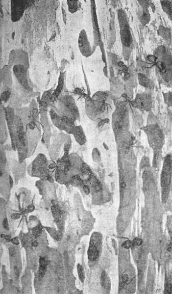 К основанию большого пня, занятого муравьями древоточцами, мы подбросили несколько крупных солдат из другого муравейника. Большие муравьи обескуражены необычной обстановкой, топчутся на месте, потом двое из них карабкаются на пень, трое исчезают во входе чужого жилища. Пришельцев не сразу замечают. Но вот около забравшегося на пень образуется небольшое сборище. Чужак робок, недвижим. Хозяева муравейника долго и тщательно ощупывают его усиками. Наконец из толпы любопытствующих выбирается крупный солдат, берет чужака за ногу и медленно тащит его в сторону от муравейника. Непрошеный гость покорен, не сопротивляется. Через некоторое время из отверстия у основания пня одного за другим вытаскивают еще трех чужаков. Те так же робки и покорны, как будто сознают, что оказались не в своем доме. Но какое миролюбие хозяев! Посторонних встретили как заблудившихся. Их не убили, не разорвали на клочки и не съели, по муравьиному обычаю, а вежливо попросили удалиться. Может быть, муравьи древоточцы не едят муравьев своего вида? Подбросим мертвого чужака. Нет, труп тоже не нужен, его тотчас оттаскивают подальше от пня. А что, если подбросить из другого гнезда куколок? Зачуяв чужой запах, солдаты, выражая тревогу, раскрыв челюсти, ударяют ими по пню. Но, видимо, запах куколок пересиливает враждебное чувство к запаху чужаков, и после долгого ощупывания усиками нашего подношения его бережно уносят в муравейник. Может быть, куколок потом съедят? Подбросим куколку, слегка проколотую иглой. Вокруг нее собирается несколько муравьев. Нет, раненая куколка не нужна, а детей в этом государстве не принято пожирать. Куколку относят подальше и бросают. Теперь мы ставим главный эксперимент. К большому еловому пню, заселенному муравьями, сверху привязываем выпиленный кусок пня другого муравейника. В нем притаилось множество муравьев древоточцев. Что теперь будет? Робко и неуверенно выползают чужие муравьи из своего укрытия, некоторые пытаются спуститься на землю. Вокруг их убежища медленно расхаживают солдаты-хозяева. Они как будто в недоумении от неожиданного появления пришельцев. Остаток дня проходит без следов какого-либо недоброжелательства. Но муравьи-хозяева стали какие-то настороженные и, сталкиваясь друг с другом, подолгу размахивают усиками. Потом хозяева скрываются в своем жилище, и ночью только головы крупных солдат виднеются во входах. Утром пень кажется необитаемым, и только пришельцы бродят по своему кусочку, иногда забираются на большой пень, возвращаются обратно. Что же с муравьями-хозяевами, чем они заняты? Когда солнечные лучи осветили ущелье и упали на большой старый еловый пень, со всех его ходов стали поспешно выбираться мелкие рабочие, степенно, не торопясь выползать большеголовые солдаты. Пень закопошился от множества его жителей, быть может, их никогда не появлялось столько сразу на его поверхности. Поведение рабочих было необычным: подбегая к солдатам и друг к другу, они мелко вздрагивали и вибрировали головой. Движения рабочих становились все быстрее и быстрее, вздрагивание головой все чаще. Медлительные солдаты, будто очнувшись, тоже затрясли головами. Возбуждение росло. Вот несколько солдат-хозяев поволокли из куска чужого муравейника робкую крылатую самку. За несколько минут у нее отгрызли большие прекрасные крылья, затем