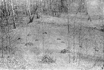 Прошел год, как было закончено строительство здания института и вокруг него проложен асфальт. В течение этого года несколько раз в день я проходил по асфальтовой дороге, ведущей от главного входа к площадке для стоянки машин, и только сейчас заметил на самой середине асфальта небольшое отверстие, из которого выскакивали крошечные муравьи. Каждый нес в челюстях комочек земли и, бросив его в сторону, мчался в свое подземелье за очередной порцией груза. Вокруг дырочки в асфальте уже был насыпан валик земли, слегка примятый и разбросанный ногами пешеходов. Неожиданная находка меня поразила. Крошечные муравьи тетрамориусы были погребены под асфальтом еще с прошлой осени, пробыли в заточении ровно год, все лето трудились в темноте, не видя света, пытаясь пробиться из плена и — пробились. Может быть, они, бедняжки, пробовали пробраться и в стороны. Но откуда взять столько силы, чтобы провести спасительный тоннель в несколько метров до края дороги. Чем же они питались во время своего длительного заточения? Может быть, ели корешки растений, случайно напали под землей на дождевого червя, личинку жука или гусеницу бабочки? С лупой я склонился над гнездом тетрамориусов. Среди вынесенных наружу комочков земли валялись чистые панцири растерзанных на части муравьев. Все содержимое было аккуратно высосано. Те, кто способен был бороться за жизнь своей семьи, своего маленького «государства», питались погибшими, ослабевшими, уставшими. С уважением смотрел я на маленьких энтузиастов. Сколько кипучей энергии заложено в каждом крошечном тельце. И теперь их ждала постоянная опасность погибнуть под ногами прохожих... Но мои опасения оказались напрасными. Через несколько дней гнездо опустело и дырочку, пробитую в асфальте, занесло мусором. Муравьи расстались со своим жилищем — своей невольной тюрьмой — и переселились на новое место. Счастливой вам жизни, муравьи!Кладбище муравьев