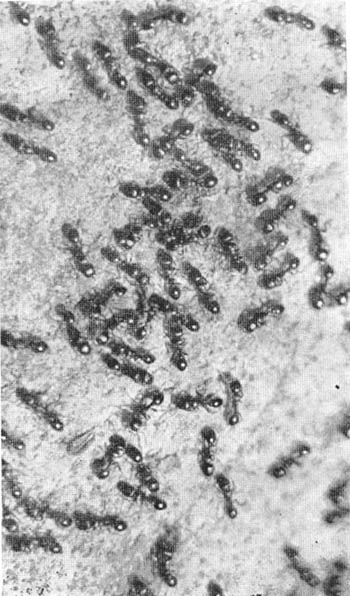 Утром солнечные лучи падают сперва на вершину солнечного склона и освещают скалы, прикрытые можжевельником. Потом золотая от солнца полоска ширится и медленно движется вниз, к дну ущелья и нашим палаткам. Мои товарищи по биваку, любители солнечных ванн, жалуются на ядовитую траву солнечных склонов, от которой, если полежать на земле, тело покрывается красными пятнышками, долго болит и чешется. Я что-то не верю в ядовитые свойства душистой богородской травки, густо покрывающей солнечные склоны ущелья, и мы, заспорив об этом, идем расследовать причину, мешающую наслаждаться утренним солнцем. — А вы попробуйте-ка, полежите сами! — предлагают мне. И действительно, стоило прилечь на пахнувшую тимолом траву, как стали ощущаться многочисленные уколы, потом жжение, зуд, а на коже проступили маленькие красные пятнышки. — Убедились! — торжествуют любители солнечных ванн и начинают уверять, что трава обжигает, даже через простыню. Я обезоружен, но не сдаюсь, внимательно разглядываю растения и вижу множество ползающих маленьких коричневых муравьев с матовыми головой, грудью и блестящим лакированным брюшком. На самом кончике брюшка в лупу видна крохотная иголочка-жало. Это маленький жалоносный муравей тетрамориус цеспитус. Он живет многочисленными поселениями, связанными друг с другом. В каждом маленьком поселении бывает несколько десятков тысяч особей, а в конгломерате связанных между собой муравейников насчитывается несколько миллионов. И все это государство незримо умещается на небольшой площади в четверть гектара. — Богородская травка ни причем, — озадачиваю я своих товарищей. — Посмотрите, сколько тут обосновалось муравьев! У каждого муравейника, конечно, найдутся защитники, они и жалят непрошеных посетителей. Теперь, собираясь загорать на солнце, выбирайте место, свободное от муравьев! И чтобы окончательно убедиться, мы прикладываем к телу муравьев и в лупу наблюдаем, как они старательно вонзают в кожу свой маленький кинжальчик и, конечно, изливают в ранку яд. Рассматривая как всегда многочисленные и связанные друг с другом колонии этого муравья, я вижу, что большинство муравьев занято перетаскиванием своих товарищей. Но это не обычный перенос, какой нам удавалось видеть у рыжего муравья, и смысл его совсем другой: носильщики стаскивали своих мертвых собратьев в специальные места — муравьиные кладбища. Вон их сколько, этих кладбищ, плотно сложенных кучек мертвых муравьев! Они рельефно выделяются темными пятнами на светлой почве. И каждая колония сносит своих покойников в отдельную кучку. В каких только позах ни лежат погибшие муравьи! Вот один в страшной боевой схватке раскрыл челюсти и расставил широко в стороны ноги. Другой весь скрючился комочком и подогнул брюшко к самой голове. Третий как-то странно изогнулся... Среди трупов кое-где виднеются и крупные мертвые матки. Их немало — в каждой кучке два-три десятка. Этот муравей очень плодовит и в каждой колонии содержится помногу яйцекладущих самок. Сколько же на каждом кладбище мертвецов? И, взяв на себя труд подсчитать, мы получаем цифру около десяти тысяч! Какова же причина такого бедствия? Муравьи часто страдают от различных заболеваний, которые вызываются грибками и бактериями. Какая-то свирепая заразная болезнь постигла этот южный склон и сейчас уносит тысячами ма
