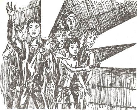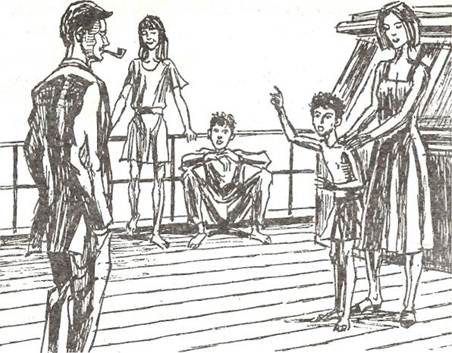 Вопли Кики и блестяще сымитированные им полицейские свистки произвели эффект разорвавшейся бомбы. Три молодых балбеса, только что бывших столь агрессивными, побелели от ужаса и как завороженные уставились на волшебную птицу. Через пару секунд, оправившись от шока, они поспешно и позорно покинули «поле боя». Вслед за ними, подхватив корзинку со змеями, мчался заклинатель.Ребята с явным облегчением смотрели вслед улепетывающим врагам. В тишине послышалось хихиканье Кики, постепенно перешедшее в громкий хохот, к которому через секунду присоединилась вся компания.Джек погладил довольного попугая по голове.— Премного тебе благодарен, Кики! Отличная работа. Судя по всему, когда Филипп заговорил о полиции, ты вспомнил о своем коронном «полицейском» номере. Что и говорить — нам всем очень повезло!— Но полиция так и не появилась, — заметила Люси.— Давайте-ка возвращаться на катер, — сказал Филипп. — По-моему, здесь небезопасно для наших барышень. Могу себе представить, какую трепку устроил бы нам Билл, если бы с ними, не дай Бог, что-то случилось.Только они собрались покинуть это негостеприимное место, как навстречу им выскочил из-за хижины мальчишка заклинателя змей. Он подбежал к Филиппу, схватил его за руку и опустился перед ним на колени.— Возьми меня с собой, господин! Була забрал змей и убежал. Он плохой человек; я его не люблю. Возьми меня с собой, господин!Филипп мягко отстранился от мальчика.— Встань. Я не могу взять тебя с собой. Я дам тебе денег.— Нет, не надо денег! Возьми Оола с собой, господин! — настойчиво продолжал упрашивать мальчик.— Это исключено, Оола!— Пожалуйста, возьми меня к себе! Оола — твой слуга, Оола будет работать на тебя. — Мальчик снова схватил Филиппа за руку. — Ты любишь змей, господин. Оола принесет тебе змей.-— Да, я люблю змей, но не таких, у которых зашита пасть. А с другой стороны, держать у себя змею, которая может укусить, слишком опасно. А что, Оола, у тебя нет родителей?Мальчик отрицательно покачал головой.— У меня только Була, он — мой дядя. Була — злой человек. Он меня бил. Вот посмотри! — И он показал ребятам многочисленные синяки и шрамы, покрывавшие его худенькое тельце.— Бедный малыш! — всхлипнула Люси. — Неужели нельзя взять его с собой, Филипп?— Нет, Люси, это невозможно. Мы не в состоянии оказать помощь всем несчастным и обездоленным, которые попадаются нам здесь на глаза — голодным собакам, маленькому ослику с кровоточащими ранами, умирающему от голода младенцу, которого мы видели несколько минут назад лежащим перед входом в хижину на каких-то грязных тряпках. Им всем нужна помощь, но не можем же мы всех их перетащить на свой катер. Нет, Оола, к сожалению, я ничем не могу тебе помочь.— Что же мне делать, что же мне делать? — в отчаянии крикнул Оола.После недолгого раздумья Филипп сказал:— Мы отведем тебя к палатке Красного Креста. Там о тебе позаботятся.Оола нехотя последовал за ними. Угрюмо повесив голову на грудь, он медленно брел, загребая босыми ногами уличную пыль. За поворотом показалась белая палатка, перед которой стояла медицинская сестра в крахмальном фартуке. Неожиданно Оола громко зарыдал и бросился бежать. У девочек выступили слезы на глазах, когда маленькая худенькая фигурка мальчика скрылась за ближайшим сараем.— Дьявол! — воскликнул Джек. — У меня такое чувство, как будто мы его пр