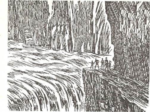 Дина проснулась первой, зажгла карманный фонарик и взглянула на часы. Уже без четверти восемь! Она разбудила остальных. Народ поднялся, зевая и потягиваясь. Тала включил свой фонарь и огляделся по сторонам.— Ай-ай-ай! — испуганно запричитал он. — Оолы нет.— Как нет? — спросил Филипп. — Куда же он делся? В это мгновение в пещере появился вымокший до нитки Оола.— Где ты был, Оола? — нахмурился Филипп. — Почему ты мокрый? Ты что — упал в воду?— Нет, господин, Оола не падал. Оола смотрел, как падает вода. Оола видел большое чудо.— Ты же мог поскользнуться и загреметь в воду. Как тебе удалось добраться до водопада?— Оола покажет господину. Чудо, большое чудо! Ты идешь, господин? Опасности нет.И он побежал по каменному выступу вокруг пещеры, направляясь к выходу. Добравшись до него, он остановился и помахал Филиппу рукой.— Иди, господин, Оола покажет дорогу! Джек вскочил на ноги.— Мы все пойдем! Такое зрелище нельзя упустить. Они включили фонари и потянулись следом за Оолой. Стоило им выбраться из пещеры, как шум водопада заметно усилился. Внизу, вдоль каменного берега, проходило что-то вроде тропинки.— Пойдемте! — крикнул Оола, взволнованно размахивая руками.Их с головы до ног окатило брызгами, и они тут же промокли до нитки. Несмотря на это, дорога оказалась сравнительно удобной. Она плавно поднималась вверх, выведя ребят в конце концов на высоту примерно четыре метра над поверхностью воды. В ущелье лился яркий дневной свет, ребята машинально выключили свои фонари.С каждым шагом шум становился все громче. Пройдя во главе маленькой процессии еще несколько десятков метров и добравшись до удобной каменной площадки, Оола остановился, театральным жестом указал вниз и воскликнул:— Здесь, господин, падает вода!Его голос едва пробивался сквозь грохот падающей воды. Тала и ребята столпились вокруг него, с любопытством заглядывая в открывшуюся у них под ногами бездну, в которую стремительно низвергались потоки воды. Они грохотали и шипели, извергая пену и тучи брызг, взлетали ненадолго в воздух и обреченно валились в заливавшую дно каньона непроглядную тьму.