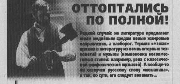 Редкий случай: не литература предлагает иныммедийным средам новые жанровые направления, а наоборот. Термин «мэшап» пришел в литературу из компьютерных технологий и музыки (компоновка несовместимых стилей: например, рэпа с классической симфонической музыкой). А вообще-то он созвучен русскому слову «мешанина», и так, по сути, его следует понимать…