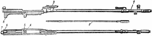 Рис. 3. Ствол со ствольной коробкой: 1 — надульник; 2 — газовый цилиндр со штоком, толкателем и пружиной; 3 — прицел; 4 — отражатель с остановом затвора; 5 — разобщитель автоматического спуска; 6 — втулка ствольной коробки; 7 — запор втулки с упором и пружиной; 8 — защелка скобы