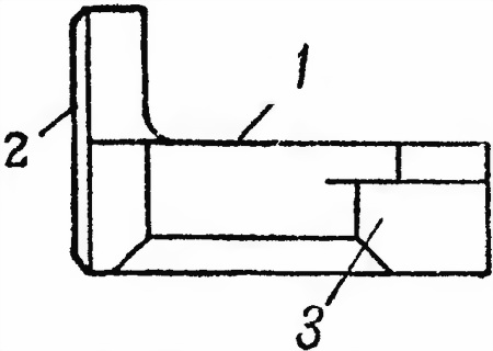 Рис. 20. Останов затвора: 1 — нижний выступ; 2 — верхний выступ; 3 — вырез 21. Останов затвора (рис. 20) служит для удержания затвора в заднем положении при израсходовании патронов из магазина. Останов имеет: нижний выступ для взаимодействия с подавателем; верхний выступ для удержания затвора и вырез для пружины, которая отжимает останов вниз.