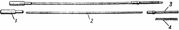 54. Принадлежность (рис. 54) служит для разборки, сборки и чистки винтовки. В принадлежность входят: а) шомпол, имеющий нарезной конец для протирки и ершика, выступ для крепления шомпола на винтовке при помощи защелки, головку с отверстием для удобства пользования шомполом при чистке совместно с шомпольной муфтой и шпилькой; б) протирка, служащая совместно с шомполом для чистки канала ствола;