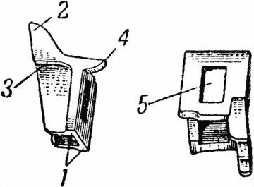 Рис. 19. Отражатель: 1 — боковые выступы; 2 — верхний выступ; 3 — ограничительный выступ; 4 — задний выступ; 5 — паз