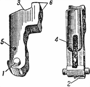 Рис. 31. Курок: 1 — цапфы; 2 — автоматический взвод; 3 — боевой взвод; 4 — продольный вырез; 5 — штифт; 6 — головка с гребнем