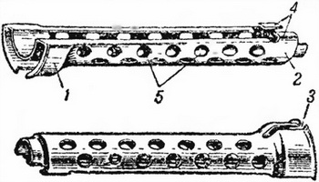 Рис. 49. Ствольная накладка: 1 — задний вырез; 2 — жолоб; 3 — поперечные вырезы; 4 — шпильки; 5 — уступ 50. Верхний кожух (рис. 50) является продолжением ствольной накладки. Он имеет: уширенный задний конец для соединения со ствольной накладкой; передний конец для соединения с надульником; задний бортик для ограничения смещения ложевого кольца; боковые загибы для соединения с нижним кожухом; отверстия для облегчения и лучшего охлаждения ствола и внутренние выступы, которыми кожух ложится на ствол.