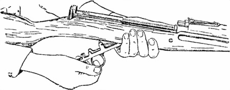 Рис. 72. Установка ударно-спускового механизма 9. Соединить ударник с остовом затвора: надеть пружину на ударник, вставить ударник с пружиной в канал остова затвора, совместить вырез ударника с отверстием для шрифта и вставить штифт. 10. Соединить остов затвора со стеблем: взять стебель затвора в правую руку вырезом вверх, рукояткой вперед, левой рукой ввести передний конец остова затвора в вырез стебля, продвинуть остов затвора доотказа назад и ввести его выступы в вырезы стебля. 11. Вставить затвор в ствольную коробку: удерживая винтовку за шейку приклада левой рукой, ввести правой рукой направляющий выступ стебля затвора в паз ствольной коробки и отвести стебель за рукоятку назад до совмещения правого его направляющего выступа с вырезом ствольной коробки, повернуть за рукоятку стебель затвора вниз и подать его доотказа вперед. 12. Вставить возвратную пружину: надеть пружину на направляющую трубку и стержень, ввести правой рукой вперед конец пружины в гнездо стебля затвора, левой рукой взять пружину около заднего конца направляющей трубки и ввести последнюю в гнездо стебля, правой рукой завести головку направляющего стержня за заднюю стенку ствольной коробки, направляя при этом передний его конец в канал трубки. 13. Вставить крышку ствольной коробки: положить винтовку прицелом вверх, надеть крышку на стебель затвора, левой рукой подать направляющий стержень пружины несколько вперед, упереть большой палец правой руки в головку стержня и продвинуть стрежень вперед доотказа; взять крышку левой рукой, ввести головку стержня в полукруглый вырез крышки и, удерживая крышку левой рукой, подать ее назад. 14. Вставить магазин: завести выступ передней стенки магазина за уступ ствольной коробки и, поворачивая магазин, подать его в окно коробки, при этом защелка магазина должна заскочить за поперечный выступ задней стенки магазина. После этого хвост защелки повернуть к ствольной коробке. 60. Примыкание и снимание штыка 1. Примыкание штыка: вынуть штык из ножны, поставить винтовку прикладом на землю, мушкой вправо, правой рукой обхватить газовую камору, удерживая левой рукой штык за рукоятку, надеть его пазом головки рукоятки на нижний выступ надульника, большим пальцем правой руки (рис. 73) нажать на защелку рукоятки штыка, левой рукой подать штык вниз доотказа, направляя при этом отверстие упора рукоятки на втулку надульника.