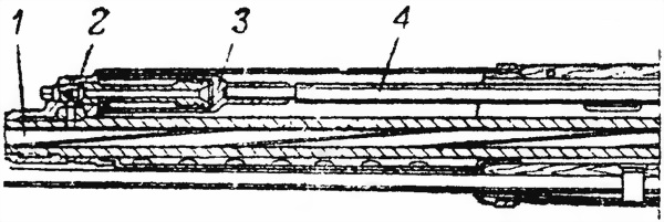 Рис. 6. Газовый регулятор: 1 — поперечные отверстия; 2 — головка; 3 — заплечико; 4 — продольный цилиндрический канал