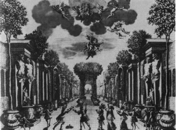 «Весь театр изображает небо, видны лишь скопления облаков. В глубине появляется сияние, и верх изображает облака, отличающиеся от нижних. Появляются Грации в прозрачном шаре в сопровождении Амура, сидящего на облаках, с которых он тотчас слетает и через весь зал проносится к амфитеатру; оттуда он возвращается на зов Граций и останавливается в передней части сцены, чтобы сыграть с ними пролог, после чего исчезает в глубине зала. Небо смыкается, сцена меняется и представляет леса Италии».Два года спустя, на волне успеха, Донно де Визе представил «Свадьбу Вакха и Ариадны» с той же нарочитой роскошью, музыкой и танцами. «Газетт» писала по поводу одной из таких пьес: «Зрители задумывались о том, уж не перенеслись ли они сами в другое место». Посмотрим теперь, что делали актеры среди этих богатых декораций. В начале века, в подражание итальянцам, в комедии еще использовали маски или пудрили лицо мукой. Сегодня установлено, что Мольер играл Маскариля из «Смешных жеманниц» в маске, а Жоделе в этой пьесе представал в своем обычном виде, с набеленным лицом. Но в классическую эпоху маска исчезла. Актеры с особенным вниманием относились к костюму, и на этот счет у нас есть исчерпывающая информация. Несколько гравюр того времени, в частности, с изображением фарсовых актеров, но главное — нотариально заверенные описи имущества покойных сообщают нам точные сведения о театральных костюмах. Их богатство и разнообразие ни в чем не уступали пышности декораций. Костюмы обычно являлись личной собственностью актеров, и нам известно, что их гардероб был достаточно богат, хотя в начале века некоторые руководители трупп располагали гардеробом, позволявшим им одевать комедиантов, которых они нанимали. Тальман де Рео утверждает, что в ту эпоху актеры одевались у старьевщика, в жалкие обноски. Вероятно, это было верно для жалких странствующих трупп. Шарль Сорель подтверждает;