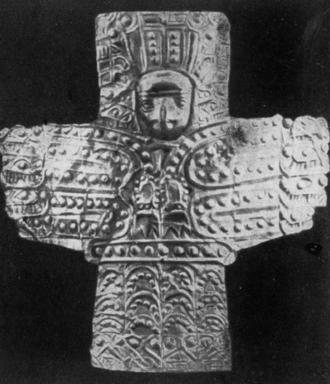 Широкой полосой протянулся вдоль Тихоокеанского побережья Южной Америки мощный горный массив — Центральные Анды. В наши дни здесь расположены большая часть Перу, часть Эквадора и Боливии. Уже в незапамятные времена жил в этих краях человек. Далеко в глубь веков уводят нас археологические находки. О том, насколько они древни, ученые горячо спорят. Одни называют VIII тыс. до н. э., другие — XVII[4]. Советский исследователь В. А. Башилов[5] считает, что спор этот пока неразрешим: слишком ограничен круг источников. Однако для ученых, занимающихся историей андских стран, важно не только установить, когда на западе Южной Америки появился человек, но и выяснить, какой путь в своем развитии он прошел. По-видимому, образно выражаясь, это был путь от Сьерры к Косте. Более позднее освоение Косты не случайно. В пустынных районах побережья редкие и бурные реки в период паводка несли разрушение, а в жаркий сезон, пересыхая, — смерть. Чтобы выжить в таких местах, люди должны были иметь познания в области ирригации, агрономии. Поэтому нельзя не согласиться с теми перуанскими исследователями[6], которые утверждают, что обосновалось на побережье население, достигшее ранее относительно высокой ступени цивилизации в Сьерре или в заандских восточных долинах. Возникновение цивилизации в Андах было связано, как и в ряде других областей нашей планеты, с переходом к земледелию, в процессе занятий которым формировались племена. Видное место среди этих цивилизаций занимает чавин, зародившаяся в XII в. до и. э. и просуществовавшая на огромной территории северной и центральной частей Сьерры и Косты вплоть до IV в. н. э. Многое в ней загадочно, бесспорно лишь одно — высокий уровень развития. И сегодня нас поражают удивительная керамика и такие великолепные произведения искусства из камня, как «стела Раймонди» (названная в честь нашедшего ее в 1872 г. путешественника Антонио Раймонди) и столб 4,5 м высотой в городе Чавин-де-Уантар, украшенные тонким и выразительным рисунком. По мастерству его исполнения чавинские каменотесы не уступают древнеперсидским резчикам, да и не только им. Огромно влияние культуры чавин на культуры последующих эпох. Ученые считают, что именно она — «прародительница перуанской цивилизации»[7]. В середине I тыс. до н. э. на территории древнего Перу складывается целая серия индейских культур: тиауанако, паракас, наска, мочика, затем на ее основе — чиму. Разной была продолжительность их существования. Например, тиауанако, появившись почти одновременно с чавин, пережила ее на много веков. Одним из наиболее интересных памятников культуры тиауанако является одноименное городище, расположенное на высоте 3800 м, неподалеку от озера Титикака. Когда-то в построенном по заранее составленному плану древнем городе было большое количество храмов и общественных зданий[8] (основное население, очевидно, жило в пригороде и ютилось в хижинах из глины, уничтоженных временем). Его главные проспекты, пересекавшиеся в центре, с поразительной точностью указывали четыре страны света. Сохранившиеся до сего времени развалины гигантских сооружений и остатки монументов поражают идеальной полировкой и оригинальным орнаментом. Техника резьбы, блестяще выполненные исполинские скульптуры, сам факт перемещения многотонных каменных глыб на значительные расстояния (поблизости 