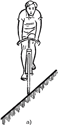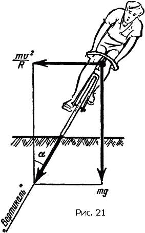 Для того чтобы этого не произошло, на крутых поворотах (или, как говорят, виражах) шоссе делают наклонным, т.е. горизонтальным для велосипедиста – так, как на рис. 22,б. Таким способом можно сильно уменьшить, а то и вовсе уничтожить стремление к соскальзыванию. Именно так устроены повороты на велосипедных треках и автострадах.