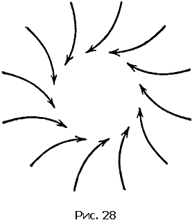 На широтах центральной Европы эффект Кориолиса будет несколько меньше, чем на экваторе. Пуля в примере, который мы только что привели, отклонится не на 3,5 см, а на 2,5 см. Маятник Фуко повернется за одну минуту примерно на 1/6 долю градуса. Должны ли учитывать силу Кориолиса артиллеристы? Пушка Берта, из которой немцы вели обстрел Парижа во время первой мировой войны, находилась в 110 км от цели. Отклонение Кориолиса достигает в этом случае 1600 м. Это уже не маленькая величина. Если летающий снаряд будет отправлен на большое расстояние без учета силы Кориолиса, то он значительно отклонится от курса. Этот эффект велик не потому, что велика сила (для снаряда в 10 т, имеющего скорость 1000 км/ч, сила Кориолиса будет около 25 кГ), а потому, что сила действует непрерывно длительное время. Конечно, влияние ветра на неуправляемый снаряд может быть не менее значительным. Поправка к курсу, которая дается пилотом, обусловлена действием ветра, эффектом Кориолиса и несовершенством самолета или самолета-снаряда. Какие специалисты, кроме авиаторов и артиллеристов, должны принять эффект Кориолиса во внимание? К ним относятся, как ни странно, и железнодорожники. На железной дороге один рельс под действием кориолисовой силы истирается изнутри заметно больше другого. Нам ясно, какой именно: в северном полушарии это будет правый рельс (по ходу движения), в южном – левый. Лишены хлопот по этому поводу лишь железнодорожники экваториальных стран. Размытие правых берегов в северном полушарии объясняется точно так же, как и истирание рельсов. Отклонения русла во многом связаны с действием силы Кориолиса. Оказывается, реки северного полушария обходят препятствия с правой стороны. Известно, что в район пониженного давления направляются потоки воздуха. Но почему такой ветер называется циклоном? Ведь корень этого слова указывает на круговое (циклическое) движение. Так оно и есть – в районе пониженного давления возникает круговое движение воздушных масс (рис. 28). Причина заключается в действии силы Кориолиса. В северном полушарии все устремляющиеся к месту пониженного давления воздушные потоки отклоняются вправо по своему движению. Посмотрите на рис. 29 – вы видите, что это приводит к отклонению дующих в обоих полушариях от тропиков к экватору ветров (пассатов) к западу.