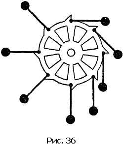 Своеобразие мира вращающихся систем не исчерпывается существованием радиальных сил тяжести. Познакомимся с еще одним интересным эффектом, теория которого была дана в 1835 году французом Кориолисом. Поставим перед собой такой вопрос: как выглядит прямолинейное движение с точки зрения вращающейся лаборатории? План такой лаборатории изображен на рис. 26. Чертой, проходящей через центр, показана прямолинейная траектория какого-то тела. Мы рассматриваем тот случай, когда путь тела проходит через центр вращения нашей лаборатории. Диск, на котором размещена лаборатория, вращается равномерно; на рисунке показаны пять положений лаборатории по отношению к прямолинейной траектории. Так выглядит взаимное положение лаборатории и траектории тела через одну, две, три и т.д. секунды. Лаборатория, как вы видите, вращается против часовой стрелки, если смотреть на нее сверху. На линии пути нанесены стрелки, соответствующие отрезкам, которые тело проходит за одну, две, три и т.д. секунды. За каждую секунду тело проходит одинаковый путь, так как речь идет о равномерном и прямолинейном движении (с точки зрения неподвижного наблюдателя).