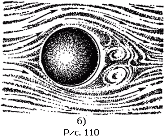 Таким образом, к воздуху и особенно к воде законы вязкого трения мало применимы: даже при малых скоростях, порядка 1 см/с, они будут годиться лишь для крошечных тел миллиметрового размера. Сопротивление, испытываемое ныряющим в воду человеком, ни в какой степени не подчиняется закону вязкого трения. Чем же объяснить, что при изменении скорости меняется закон сопротивления среды? Причины надо искать в изменении характера обтекания жидкостью движущегося в нем тела. На рис. 110 изображены два круговых цилиндра, движущихся в жидкости (ось цилиндра перпендикулярна к чертежу). При медленном движении жидкость плавно обтекает движущийся предмет – сила сопротивления, которую ему приходится преодолевать, есть сила вязкого трения (рис. 110, а). При большой скорости позади движущегося тела возникает сложное запутанное движение жидкости (рис. 110, б). В жидкости то появляются, то пропадают различные струйки, они образуют причудливые фигуры, кольца, вихри. Картина струек все время меняется. Появление этого движения, называемого турбулентным, в корне меняет закон сопротивления.