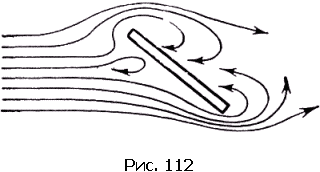 С возрастанием угла подъемная сила растет. Но рассуждение, основанное на одних лишь геометрических соображениях, привело бы нас к неверному выводу, что чем больше угол к направлению движения, тем лучше. На самом же деле по мере увеличения угла плавное обтекание плоскости все затрудняется, а при некотором значении угла, как это иллюстрирует рис. 112, возникает сильная турбулентность; сопротивление резко возрастает, и подъемная сила падает.