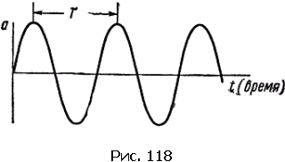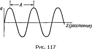 Если бы звук распространялся мгновенно, то все частицы воздуха колебались бы, как одна. Но звук распространяется не мгновенно, и объемы воздуха, лежащие на линии распространения, приходят в движение по очереди, как бы подхватываются волной, идущей от источника. Так же точно щепка лежит спокойно на воде до тех пор, пока круговые водяные волны от брошенного камешка не подхватят ее и не приведут в колебание. Остановим наше внимание на одной колеблющейся частице и сравним ее поведение с движением других частиц, лежащих на той же линии распространения звука. Соседняя частица придет в колебание немного позже, следующая – еще позже. Запаздывание будет нарастать, пока, наконец, мы не встретимся с частицей, отставшей на целый период и поэтому колеблющейся в такт с исходной. Так отставший на целый круг неудачный бегун может пройти линию финиша одновременно с лидером. На каком же расстоянии встретим мы точку, колеблющуюся в такт с исходной? Нетрудно сообразить, что это расстояние λ равно произведению скорости распространения звука с на период колебания Т. Расстояние λ называется длиной волны, λ = сТ. Через промежутки λ мы будем встречать колеблющиеся в такт точки. Точки, находящиеся на расстоянии λ/2, будут совершать движение одна по отношению к другой, как предмет, колеблющийся перпендикулярно, к зеркалу, по отношению к своему изображению. Если изобразить смещение (или скорость, или звуковое давление) всех точек, лежащих на линии распространения гармонического звука, то получится опять синусоида. Не следует путать графики волнового движения и колебаний. Рис. 117 и 118 очень похожи, но на первом по горизонтальной оси отложено расстояние, а на втором – время. Один рисунок представляет собой временную развертку колебания, а другой – мгновенную «фотографию» волны. Из сопоставления этих рисунков видно, что длина волны может быть названа также ее пространственным периодом: роль Т во времени играет в пространстве величина λ.