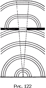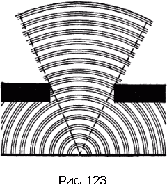 Вы находитесь в глубине комнаты во втором этаже и разговариваете. Открыто окно. За окном ваш товарищ. Услышит ли он вас? Да, если вы будете говорить достаточно громко, но все-таки он будет слышать гораздо хуже, чем в том случае, если он влезет на лестницу и станет против окна. Звуковые волны, выходя из окна, как бы растекаются во все стороны, но как-то неохотно. Это показывает, что звуковые волны лучше всего распространяются вперед по прямым линиям, но в какой-то степени отклоняются и в стороны. Относится ли это к любым звуковым волнам? Оказывается, нет. Существенную роль играет соотношение между длиной волны и размерами отверстия. Если длина волны велика по сравнению с этими размерами, то, выходя из отверстия, волны «растекаются» во все стороны, как будто само отверстие является источником звука. Наоборот, если длина волны гораздо меньше размеров отверстия, звук распространяется по лучам, и там, где прямая линия, проведенная от источника звука к наблюдателю, попадает в препятствие (в нашем примере – в стену), возникает «тень»: звука почти не слышно. В нашем примере средней частоте человеческого голоса в 1000 Гц соответствует длина волны 30 см. Поэтому такие волны в метровом оконном проеме распространяются охотнее всего вперед, но заметно отклоняются и в стороны. Изобразить огибание препятствий звуковыми волнами на рисунке очень трудно. Гораздо проще показать, как в похожей ситуации ведут себя поверхностные волны на воде. Об этих волнах мы поговорим чуть позже. Свойства таких волн несколько своеобразны. Однако, что касается правил огибания волнами препятствий, то они одинаковы и для водяных, и для звуковых воздушных волн. Рис. 122 и 123 изображают прохождение водяных волн разной длины через какое-либо отверстие. На рис. 122 длина волны существенно больше размера отверстия. В этом случае волна почти полностью заполняет область за экраном. На рис. 123 изображена волна очень малой длины. Теперь распространение волны происходит по лучам. В область геометрической тени волна почти не заходит.