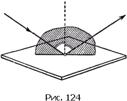В этом параграфе мы будем предполагать, что длина звуковой волны достаточно мала и, следовательно, звук распространяется по лучам. Что происходит, когда такой звуковой луч падает из воздуха на твердую поверхность? Ясно, что при этом происходит отражение звука. Но куда он отражается? Аналогия распространения звука с движением материальных частиц показывает, что такое отражение должно происходить так же, как отражение мячика от стенки, с той только разницей, что в результате процессов трения при ударе скорость мячика уменьшится, в то время как скорость распространения звука, связанная лишь со свойствами воздушной среды, конечно, не изменится. Трение здесь скажется не в изменении скорости звука, а в том, что при отражении часть энергии звуковых волн перейдет в тепло. Поскольку отражение звука не отличается в принципе от упругого удара, закон отражения звука можно сформулировать следующим образом: угол падения звукового луча, т.е. угол, составленный лучом и нормалью (т.е. перпендикуляром) к участку поверхности, на который он попадает, равен углу отражения, причем отраженный луч находится в плоскости, проходящей через падающий луч и нормаль к поверхности. Эта плоскость называется плоскостью падения луча. Итак, если мы хотим узнать, куда пойдет отраженный луч, надо поступить следующим образом. В месте падения луча проведите нормаль, измерьте угол падения, постройте плоскость падения. Затем в этой плоскости отложите по другую сторону от нормали угол, равный углу падения; полученная прямая и представит собой отраженный луч (рис. 124).