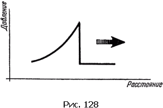 Со словом «волна» в житейской практике связано представление о периодическом процессе, наглядным примером которого является волнение на море. Покачаться на «волнах» – излюбленное развлечение купальщиков. В физике пользуются словом «волна» в более широком смысле и говорят о распространении волны и в том случае, когда местное повышение или понижение давления вызвано однократным ударом, взрывом или засосом воздуха. Очень своеобразно выглядит воздушная волна, создаваемая взрывом. (Мы уже говорили, что воздушную волну можно сфотографировать, поэтому слово «выглядит» вполне подходит к волне давления.) На рис. 128 изображен мгновенный профиль такой взрывной волны – кривая изображает распределение давления вдоль какого-либо направления распространения волны. Профиль волны составляется постепенным подъемом, завершающимся отвесным спуском. Направление движения волны показано на схеме слева направо. Участки воздуха, расположенные правее фронта, в рассматриваемое мгновение покоятся – до них волна еще доберется.
