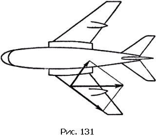 Снаряд, летящий со сверхзвуковой скоростью, можно сфотографировать. Резкое различие плотностей воздуха вокруг снаряда отчетливо обрисовывает фронт ударной волны, порождаемой им. Чем быстрее движется снаряд, тем острее конус. Ударная волна является основным источником сопротивления, испытываемым телом, движущимся со сверхзвуковой скоростью. А при скоростях движения, которые меньше скорости звука, сопротивление создается, как мы говорили, в основном возникновением турбулентного движения. Поэтому наиболее выгодные формы тела для движений этих двух типов различны. Что выгодно для быстрых движений, то невыгодно для более медленных, и наоборот. Тело, заостренное впереди, способствует турбулентности и, значит, увеличивает сопротивление движению с дозвуковыми скоростями. Напротив, заостренная форма снаряда уменьшает сопротивление ударной волны. Тупое впереди тело уменьшает турбулентность и потому более выгодно при дозвуковых скоростях, чем заостренное. При переходе через звуковой барьер эта форма становится менее выгодной, так как основным источником сопротивления становится ударная волна. По этой причине снаряды орудий заострены спереди – ведь они движутся со сверхзвуковыми скоростями. Ликвидировать ударную волну и вместе с ней основной источник сопротивления тела, рассекающего воздух со сверхзвуковой скоростью, к сожалению, невозможно. Задача конструкторов снарядов и самолетов состоит в том, чтобы ослабить сопротивление, создаваемое ударной волной. Для снарядов и корпуса самолета уменьшение сопротивления достигается заострением формы. А какую идею можно предложить для крыльев? Сверхскоростные самолеты приобрели за последнее десятилетие новые очертания: крылья прижались к корпусу, самолет приобрел стреловидную форму. Сделано это именно для того, чтобы бороться с сопротивлением ударных волн (рис. 131).