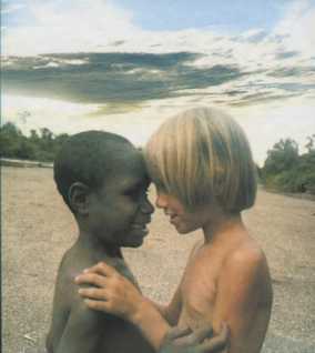 Подошел Кристиан, и мы стали изучать это выдающееся творение, потом я хотела вернуть лук и стрелы. Но он покачал головой и отказался взять их. Кристиан первым понял, что тот хотел сделать мне подарок — я очень обрадовалась. Знаками я дала мальчику понять, чтобы он меня немного подождал. Я побежала домой, вытряхнула свой рюкзак на кровать и стала искать ответный подарок. Тут я увидела маленькое красное зеркальце, которое мне подарили в столице Джаяпура. Обрадованная, я пулей вылетела на улицу и протянула его мальчику. С такой реакцией мы еще никогда не сталкивались! Он посмотрел в зеркало, вскрикнул и упал. Мы засмеялись, Кристиан поднял зеркальце, показал мальчику свое в нем отражение и снова протянул ему. Тем временем к нам подошли другие фаю, чтобы посмотреть, что происходит. Мальчикосторожно взял зеркало. Его глаза округлились. Он двигал головой туда-сюда, делал гримасы, трогал свое отражение рукой. Скоро возникло общее возбуждение — все фаю хотели хоть раз посмотреть на свое лицо. Мы с Кристианом здорово повеселились, наблюдая, что чувствует человек, первый раз увидевший себя в зеркале. Потом мы отошли от толпы, чтобы насладиться тем, что нас интересовало гораздо больше — новыми стрелами и луком. Вскоре к нам подошел мальчик фаю, как трофей неся в руке зеркало. Он показал на себя пальцем и сказал: «Туаре». Я показала на себя и сказала: «Сабина». Он без труда повторил мое имя. Потом Кристиан показал на себя и сказал: «Кристиан». Туаре попытался выговорить имя брата, но у него не получилось. Слова в языке фаю всегда заканчиваются на гласную. Тогда мой брат снова показал на себя и сказал: «Бабу». Так мы называли его раньше, когда еще жили в Непале. Туаре с легкостью повторил это имя, и с тех пор все звали брата Бабу. Туаре стал мои близким другом по играм — моим лучшим другом, кому я больше всего доверяла. Он и сейчас считает меня своей сестрой. Благодаря Туаре и другие дети перестали нас бояться. Они все приходили и приходили: Бебе, Абусаи, Атара, Ори, Аилакокери, Дихида и Эсори...