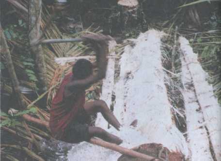 Однажды кто-то из знакомых прислал нам из Америки картинку, где было нарисовано мороженое. Для чего это было сделано, не знаю до сих пор, но мама повесила ее рядом с нашим обеденным столом, и мы, дети, любовались изображением. Я и сейчас прекрасно помню рисунок: часть серебряной чаши, а в ней пятнадцать или шестнадцать шариков мороженого, все разного цвета. Все это венчает корона из сливок, а на ней — красная вишня. Как часто мы мечтали о таком мороженом в жаркие дни! Иногда мы садились перед картинкой и пытались угадать сорта мороженого. Наша фантазия не знала границ: белое было из саго, оранжевое — из манго, желтый шарик мог быть с добавлением сладкого картофеля и т. п. Никто из нас, детей, не помнил вкуса мороженого, но выглядело оно потрясающе. Мы знали одно: мороженое — это самое вкусное лакомство на земле. Когда через несколько лет мы оказались в Джакарте, столице Индонезии, больше всего мы обрадовались, что можем попробовать мороженое. Едва прилетев, мы увидели кафе-мороженое и хотели тут же пойти в него, но мама сказала, что в одиннадцать кафе закрывается. Мы страшно расстроились и не совсем ей поверили, но она пообещала, что следующим утром мы пойдем прямо туда. И наконец-то он наступил: день великого мороженого, как мы его называли с тех пор. Волнуясь, мы вошли в кафе. Невозможно было охватить взглядом все то количество мороженого, что предстало перед нами. Родители, с улыбкой наблюдавшие за нами, сразу заказали самую большую чашу, которая была в кафе. Мороженое называлось «Землетрясение». Пятнадцать крупных шариков разных цветов — мы были на седьмом небе от счастья. Исполнилось одно из наших самых заветных желаний! И мороженое действительно оказалось таким вкусным, как мы себе представляли. Я помню, как мы наслаждались. Родители тоже не отставали. Мы даже не ссорились. Как только с «Землетрясением» было покончено, мы стали просить еще. Мама предупредила, что у нас заболят животы, но мы не слушали и съели еще одну чашку. Когда после обеда мы вернулись в отель, конечно, мы все заболели. Целый день мы пролежали в постели. Наши желудки не привыкли к холодной пище, в джунглях не было холодильника, да и повседневная пища была совсем другой... В джунглях рацион питания очень ограничен. Мы ели одно и то же: мясо, рыбу, саго — сердцевину болотной пальмы, рис, сладкий картофель, кукурузу, папайю и казби — корешки невысокого деревца, на вкус похожие на картофель. Позднее стали сажать тыквы. Если поднималась вода или наши грядки затаптывало стадо кабанов, выбор становился еще меньше. Но мы были детьми, и так хотелось вкусненького. Чаще всего мы ели плод хлебного дерева, или ква, как его называли фаю. Прямо перед нашим домом росло такое дерево, и мы нередко забирались на него с длинной палкой в руках. На ее конце был закреплен нож, им и срезали плоды. Оставалось только положить их в костер. Когда плод снаружи становился совсем черным и начинал тлеть, его доставали с помощью стрелы, и кто-нибудь из фаю разбивал его ступней. Я долго удивлялась этому их умению и наконец тоже решила попробовать, не понимая, что подошва моей ступни совсем не такая твердая. Наступив на вынутый из костра плод, я обожглась, закричала и запрыгала на одной ноге. Кристиан долго смеялся. А мама выругала меня. Появились настоящие ожоги на ноге, и несколько дней я хромала. Прошло много вре