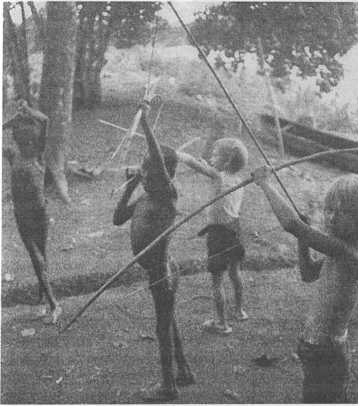 Для фаю лук и стрелы — самый ценный товар. Они пользуются ими и для охоты, и для защиты, и для нападения. Лук должен соответствовать росту: быть на полметра длиннее его обладателя. Делают его из особого сорта древесины, натягивают с помощью бамбукового ремня. Наконечники у стрел бывают трех разновидностей: деревянные, бамбуковые и костяные. Деревянные, называемые цехаи, служат для охоты на небольших зверей и птиц. Стрелы багаи — с широкими наконечниками из бамбука — используют для охоты на диких свиней и страусов. Широкий наконечник нужен для того, чтобы зверь быстрее истек кровью. И наконец, фаи — наконечник для стрел, которыми убивают людей. Их делают из костей кенгуру. Лук украшают перьями убитых на охоте птиц. На стрелах выцарапывают знаки, которые указывают на охотника — чтобы не было сомнений относительно владельца стрелы. Это настоящие произведения искусства, на которыми мы, дети, с удовольствием любовались. Лук всегда выглядел очень красиво, хотя и приносил много горя. Я много раз была свидетелем того, как дети стреляли из лука в своих родителей, когда злились и не получали того, чего хотели. И даже папу однажды атаковали. Один юноша рассердился на него, не долго думая, схватил лук, натянул стрелу и прицелился. И тогда отец поступил очень неожиданно. Он подошел прямо к фаю и обнял его. Такого никто не ожидал! Белый человек повел себя настолько невероятно вопреки здравому смыслу, что фаю не знал, как ему реагировать. И отца больше никогда не трогали. Но осторожность есть осторожность. Отец всегда старался вести себя с фаю правильно, не выказывать злобу — нельзя было гарантировать, что стрела не поднимется на белого человека.